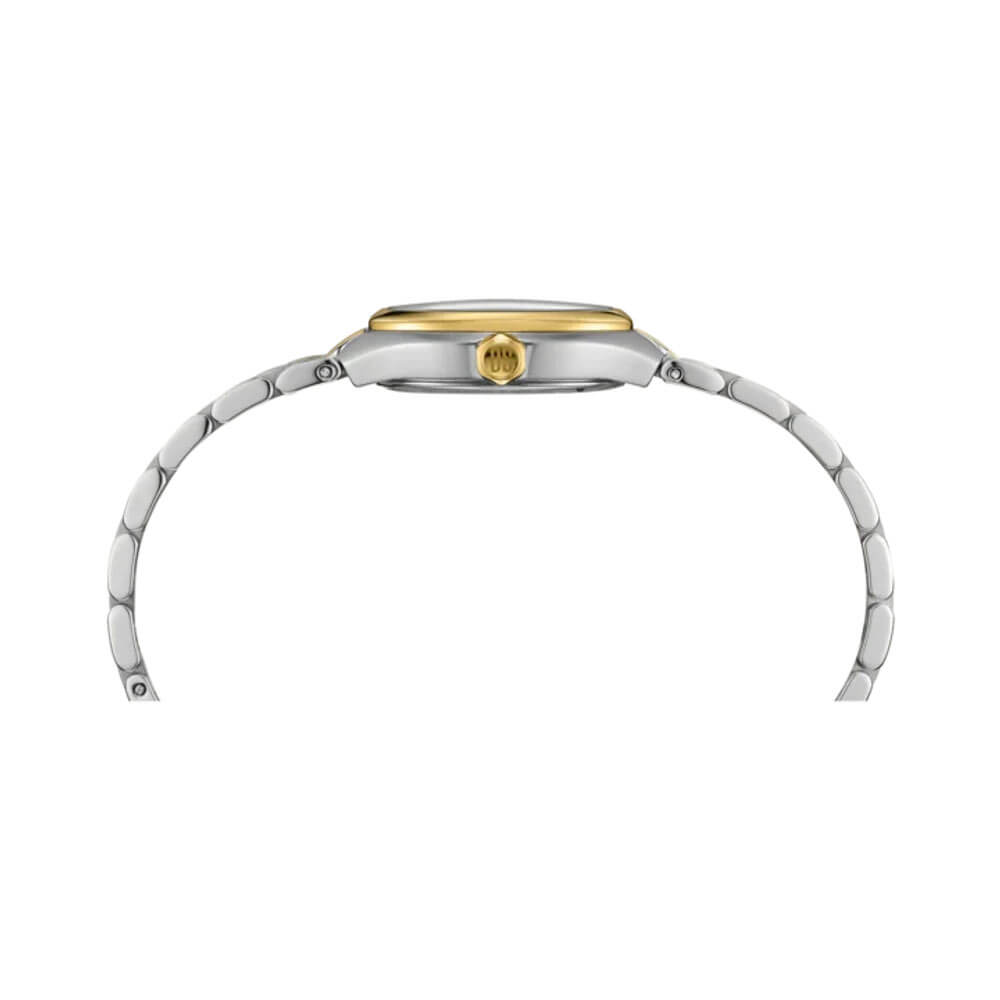 Pouzdro o průměru 27,80 mm je vyvedeno ve stylu bicolor, kde je ušlechtilá ocel kombinována s pozlacenými prvky, což podtrhuje jeho vytříbený charakter. Náramek, rovněž v dvoubarevném provedení, má pozlacené články, které dodávají celku jednotný, šperkový efekt. Hodinky jsou odolné pro každodenní použití a jejich štíhlá forma zajišťuje pohodlí při nošení i po mnoho hodin. Vodotěsnost do 100 metrů znamená, že se tento časoměr vody nebojí — je možné s nimi bez obav plavat.