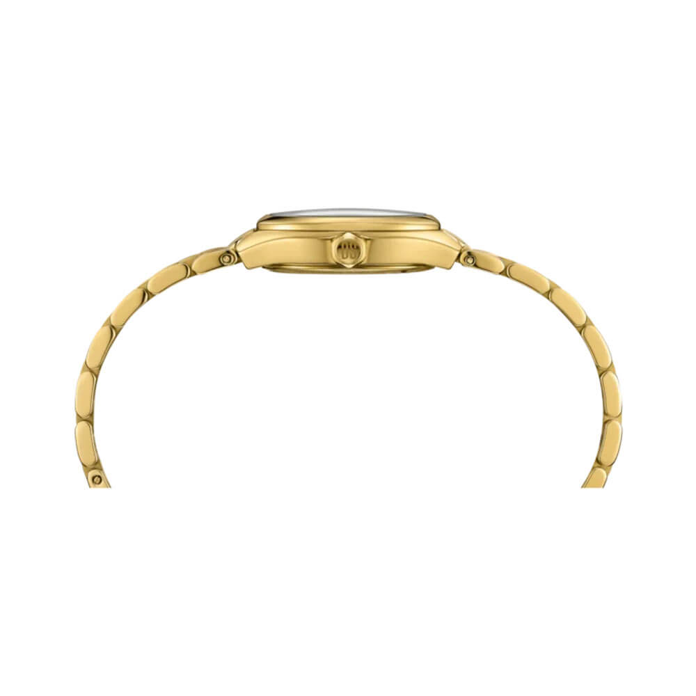 Pouzdro o průměru 27,80 mm je laděno do zlatého odstínu, kde byla ušlechtilá ocel doplněna o zlatou povrchovou úpravu PVD, která podtrhuje jeho vytříbený charakter. Náramek, rovněž v zlatém tónu, má ocelové články, které dodávají celku harmonický, šperkový efekt. Hodinky jsou odolné vůči každodennímu používání a jejich štíhlá forma zaručuje pohodlí i při dlouhém nošení. Vodotěsnost do 100 metrů znamená, že se tento časoměřič vody nezalekne — můžete s ním bez obav plavat.