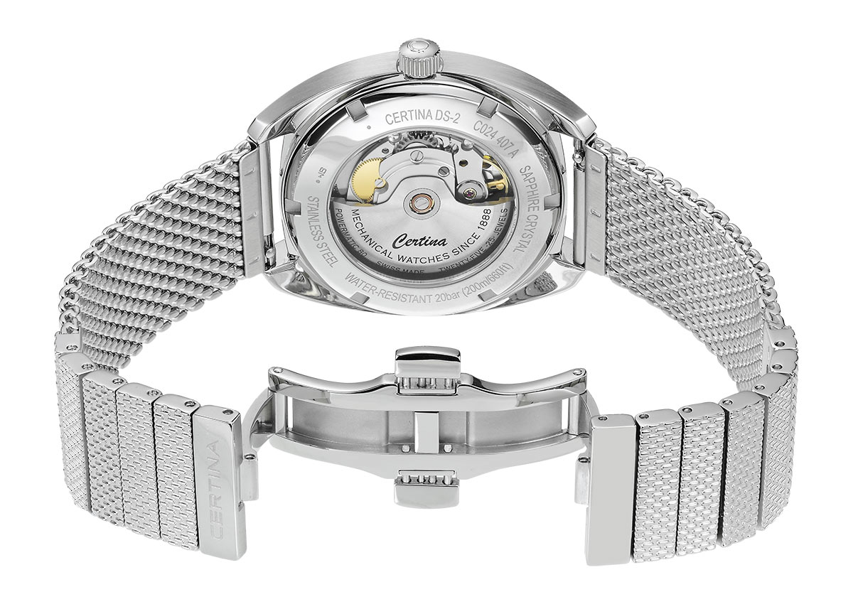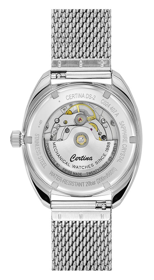 Pánské hodinky Certina DS-2 Powermatic 80 C024.407.11.051.00 jsou klasický model se sportovní odolností, perfektní pro dobývání světa v obleku. Výjimečná třída voděodolnosti 20 barů. Jeho srdcem je moderní mechanický Machineek s automatickým Powermatic 80.611 s 80hodinovou rezervou chodu a spirálovou pružinou ze slitiny Nivachron™. Jedná se o inovativní materiál vyvinutý pro zvýšení odolnosti proti interferenci magnetických polí s přesností. Balanční pružina Swiss Made na bázi titanu je také extrémně odolná vůči teplotním výkyvům a má působivou odolnost proti nárazu. Klasické automatické hodinky Certina C024.407.11.051.00 jsou umístěny v pouzdru z nerezové oceli vysoce odolné proti poškrábání a korozi s tradiční velikostí 40 milimetrů. Disponuje systémem DS (Double Security). Elegantní černý ciferník je lakovaný a má ocelové indexy a ručičky, které jsou vyplněny ve tmě svítící Super-Luminova. Na pozici 3 hodin je na bílém pozadí čitelné datumové okénko obklopené ocelovým rámem. Pouzdro se vyznačuje zaobleným profilem, který v kombinaci s malými rozměry, barvou ciferníku a konstrukcí náramku dodává charakteru výše uvedeného modelu retro prvek. Celý ciferník kryje vypouklé, proti poškrábání a křišťálově čisté safírové sklíčko obohacené o antireflexní vrstvu na vnitřní straně.
