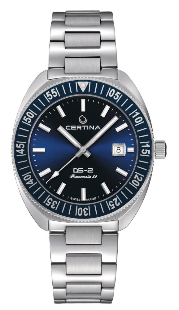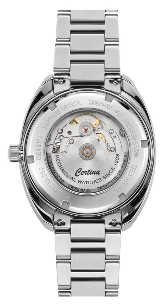 Tyto hodinky mají pouzdro toneau o průměru 41,10 mm, které bylo utěsněno na 200 metrů. Na přední straně je otočná luneta se stupnicí užitečnou při potápění. Luneta je vyrobena z oceli a prsten je vyroben z hliníku. Vysoce čitelný modrý ciferník chrání safírové sklo vysoce odolné proti poškrábání s antireflexní vrstvou. Výrobce vybavil časomíru velkými a čitelnými ručičkami a datumovkou s aktuálním dnem v měsíci na pozici 3 hodin. Super-LumiNova je podsvícení, které bylo nalezeno na ručičkách, indexech a stupnici na lunetě. Na zadní straně pouzdra je víko s okénkem, kterým můžete obdivovat práci mechanismu. Certina C024.607.11.041.02 je vybavena přesným systémem poháněným pohybem zápěstí - Powermatic 80. Automatické srdce má rezervu chodu až 80 hodin, což vám umožní bez obav si odpočinout v používání tohoto modelu o zastavení jeho práce. Pouzdro je spárováno s elegantním stříbrným náramkem s motýlkovým zapínáním. Certina DS 2 Powermatic 80 má v ceně přídavný kožený řemínek. Náramek a řemínek mají funkci rychlé výměny bez použití dalších náMachineů.