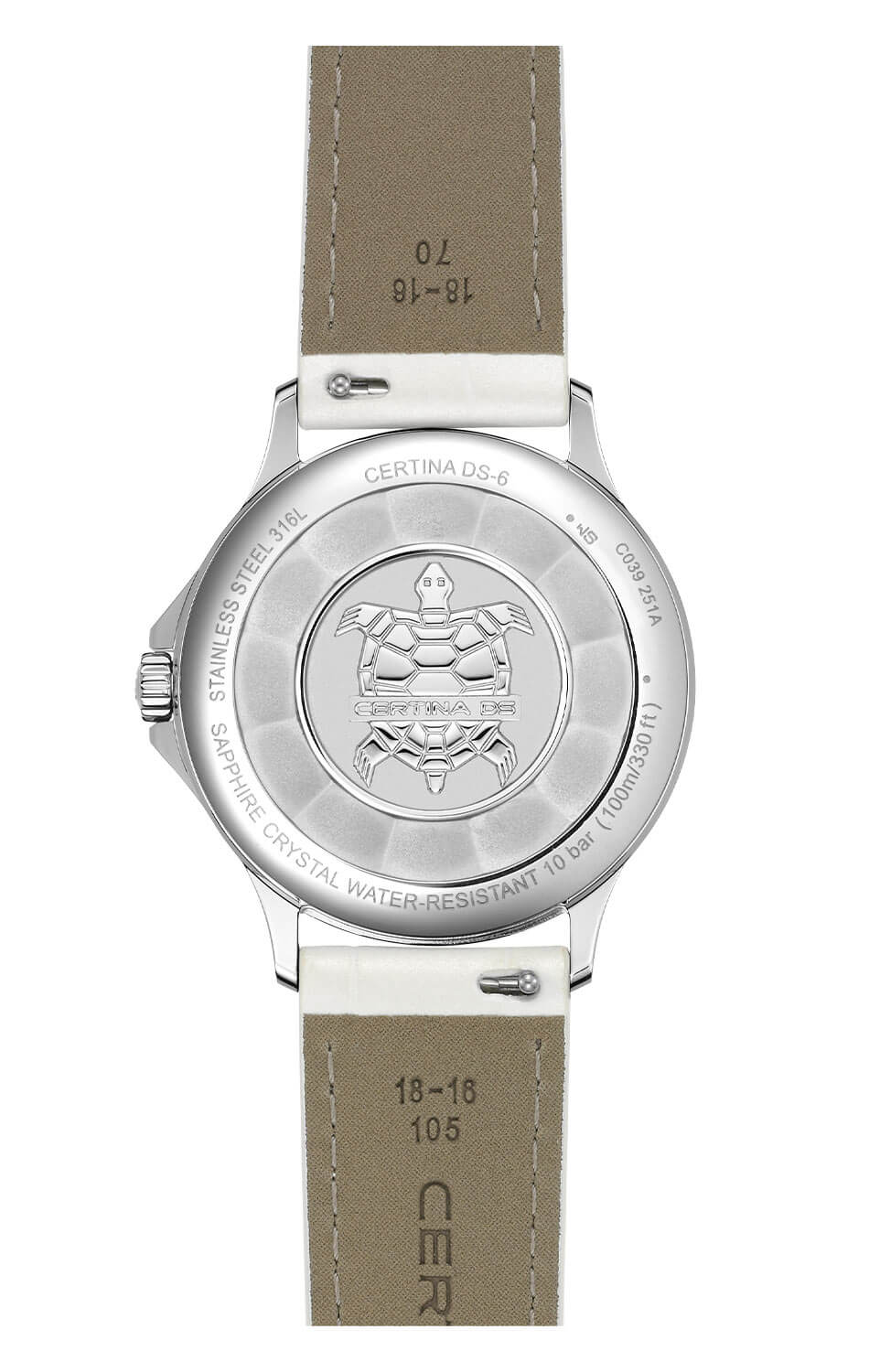 Materiály nejvyšší kvality zaručují odolnost a krásu tohoto modelu. Pevné pouzdro z ušlechtilé oceli 316L ve stříbrném odstínu o průměru 35 mm zachovává lesk a odolnost proti poškrábání, chráníc jemný mechanismus uvnitř. Ciferník je chráněn safírovým sklem – mimořádně tvrdým a odolným proti poškrábání – díky čemuž si hodinky po dlouhou dobu zachovají dokonalý vzhled. Vodotěsnost na úrovni 100 metrů (10 ATM) zajišťuje, že model DS 6 není ohrožen náhodným postříkáním ani ponořením do vody během každodenních aktivit. Celek doplňuje bílý řemínek vyrobený z přírodní kůže, který je měkký a elegantní – tyto hodinky Certina na koženém řemínku nejen dobře vypadají, ale také poskytují pohodlí při celodenním nošení. Bílá barva řemínku dodává svěžest a podtrhuje univerzální charakter časoměru, který se snadno přizpůsobí téměř každému stylu.