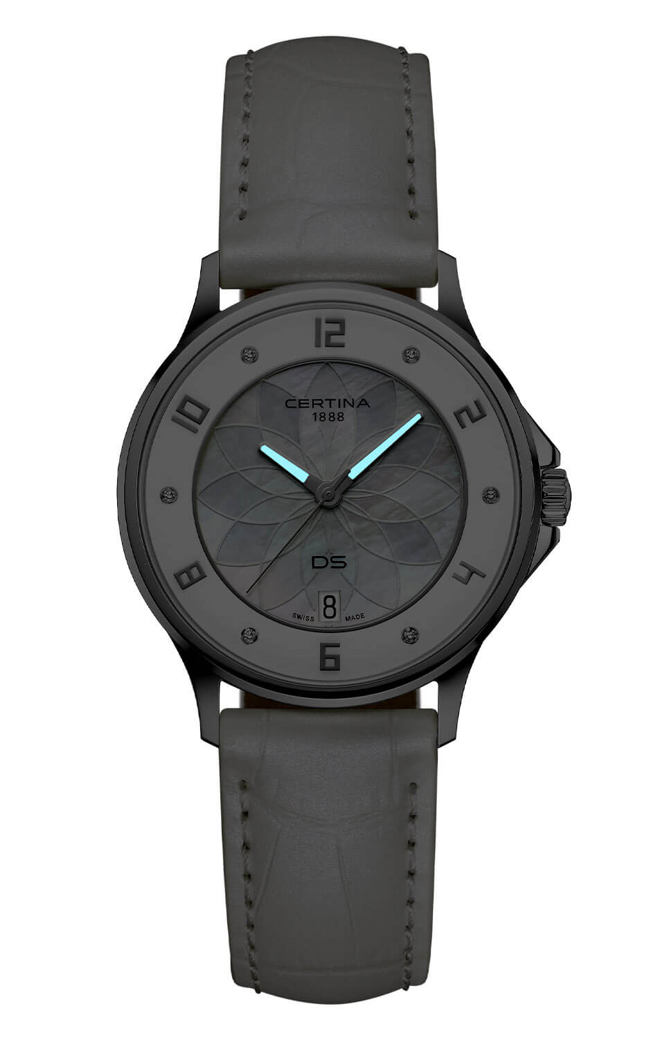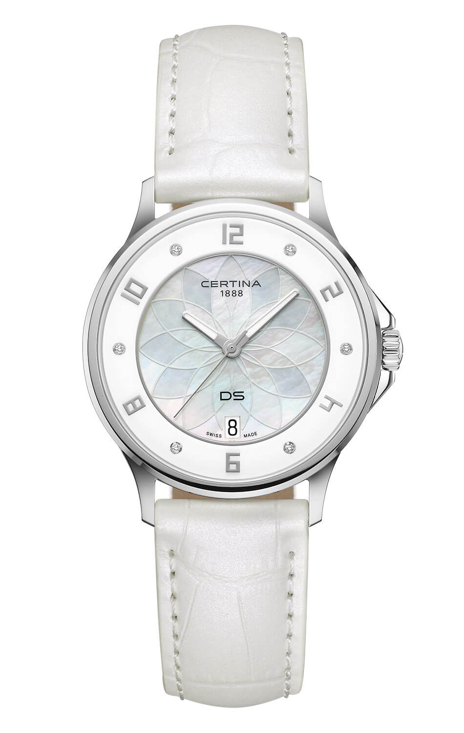 Certina DS-6 Lady Diamonds C039.251.16.116.00 patří do exkluzivní kolekce Certina DS-6 Diamonds – na ciferníku září pravé diamanty a zpracování má šperkařský charakter. Ciferník hodinek je skutečným mistrovským dílem – kombinuje luxusní detaily s přehledným uspořádáním. Vyrobený z přírodní perleti, ciferník se při každém pohybu zápěstí jemně třpytí duhovým leskem, poutajíc pozornost jako vytříbený šperk. Jeho střed zdobí jemný květinový motiv a okolo jsou rozmístěny diamantové indexy hodin střídající se s arabskými číslicemi – takový design zaručuje jak oslnivý vzhled, tak snadné čtení času. Na pozici šesté hodiny se nachází praktický ukazatel data, který je diskrétně začleněn do ciferníku, takže uživatelka má vždy po ruce aktuální datum. Srdcem těchto hodinek je švýcarský quartzový mechanismus nejvyšší třídy, jehož impozantní přesnost byla potvrzena certifikátem COSC. Díky němu tyto hodinky s perletí a diamanty nabízejí přesnost, jakou lze očekávat od chronometru – každý den strávený s DS-6 Lady Diamonds je spojením luxusu, spolehlivosti a přesnosti.