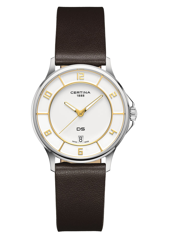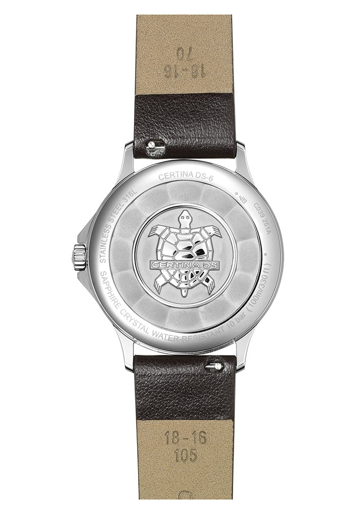 Dámské hodinky Certina DS-6 Lady C039.251.17.017.01 v pouzdru z nerezové oceli o průměru 35 mm. Krásný ciferník se zlaceným okrajem a arabskými indexy. Velké, jasné hodinové a minutové ručky jsou naplněny Super-LumiNova® . Po předchozí expozici svítí jasnou jasnou září, takové řešení je užitečné ve tmě. Celou konstrukci chrání safírové sklo odolné proti poškrábání s antireflexní vrstvou. Poskytuje další transparentnost. Srdcem hodinek je quartzový Machineek, napájený baterií ETA F05.412, jejíž přesnost potvrzuje certifikát chronometru COSC . Certina DS-6 Lady je voděodolná do 10 bar / 100 m díky známému bezpečnostnímu systému Certina DS. Časovač je perfektní nejen pro každodenní použití, ale také pro plavání. Hodinky jsou spárovány s hnědým řemínkem z ekologického PET materiálu . Na spodní straně popruhu je podložka pro větší pohodlí při nošení.