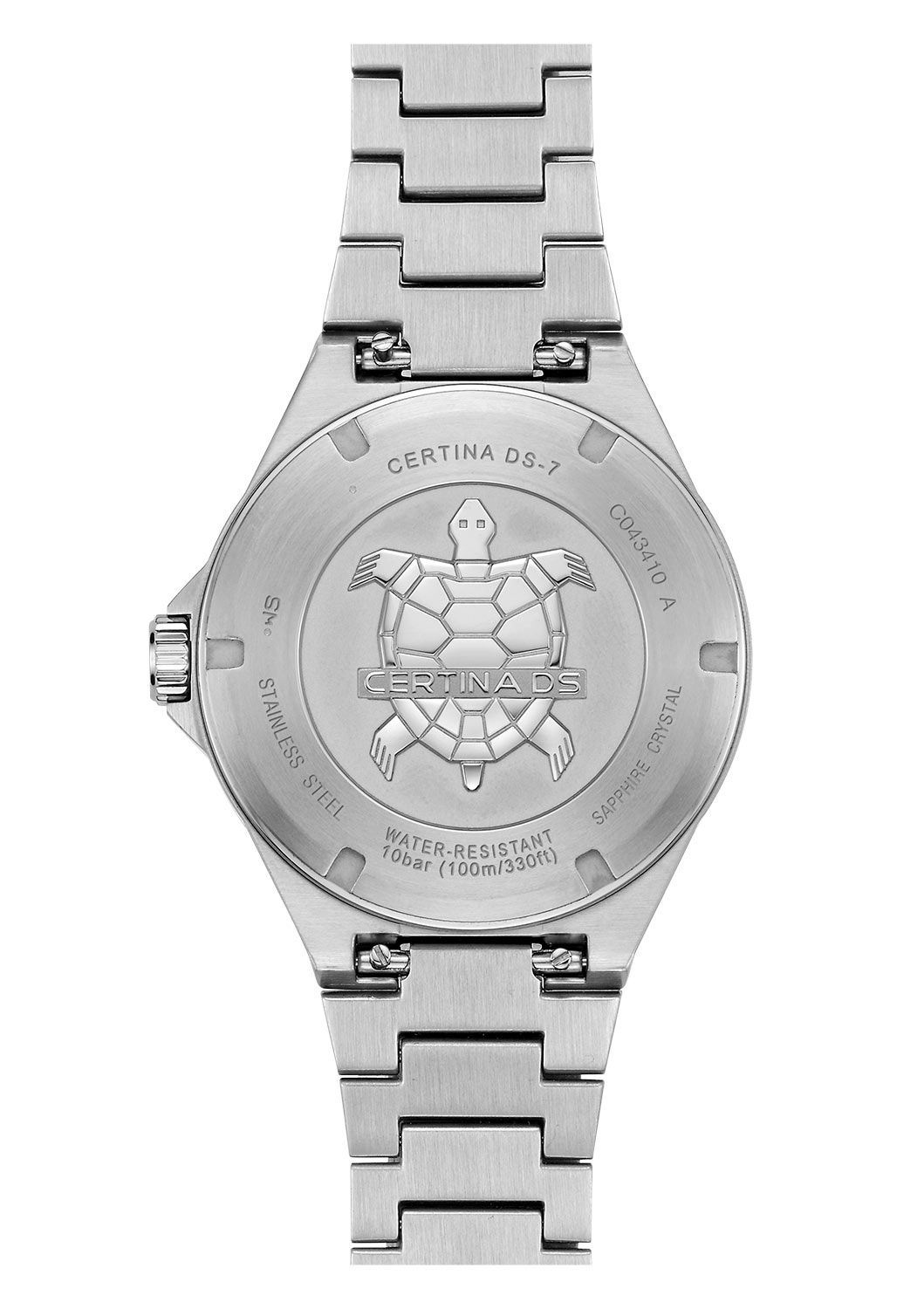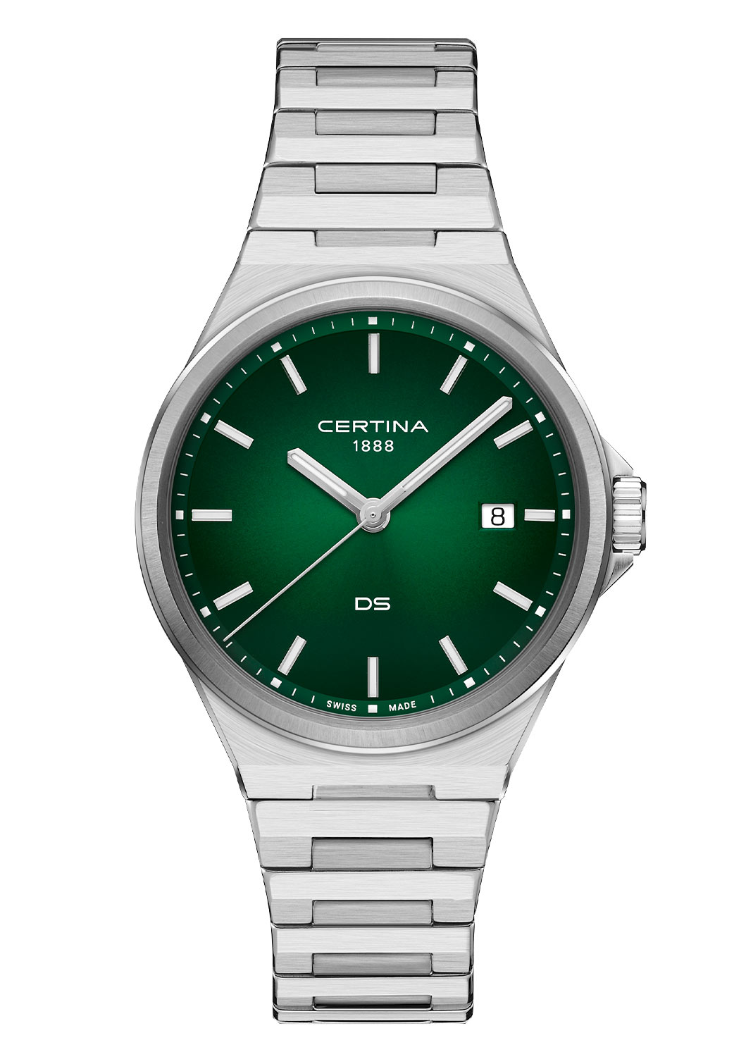 Esteticky atraktivním prvkem je zelený číselník. Ocelové indexy a ručičky zaručují čitelnost, která díky švýcarskému světelnému povlaku Super-LumiNova® zůstává zachována i ve tmě. Minimalistický ukazatel data na třetí hodině poskytuje pohodlný přístup k aktuálnímu datu. Celý číselník chrání proti poškrábání safírové sklíčko s antireflexní vrstvou. Hodinky s mechanismem ETA Precidrive™ představují nový směr ve sportovním stylu a nádech svěžesti v tradiční řadě sportovních hodinek Certina. Prezentované hodinky Certina DS-7 jsou dokonalým a stylovým doplňkem kombinovaným s švýcarskou precizností a budou kompletním doplněním šatníku.