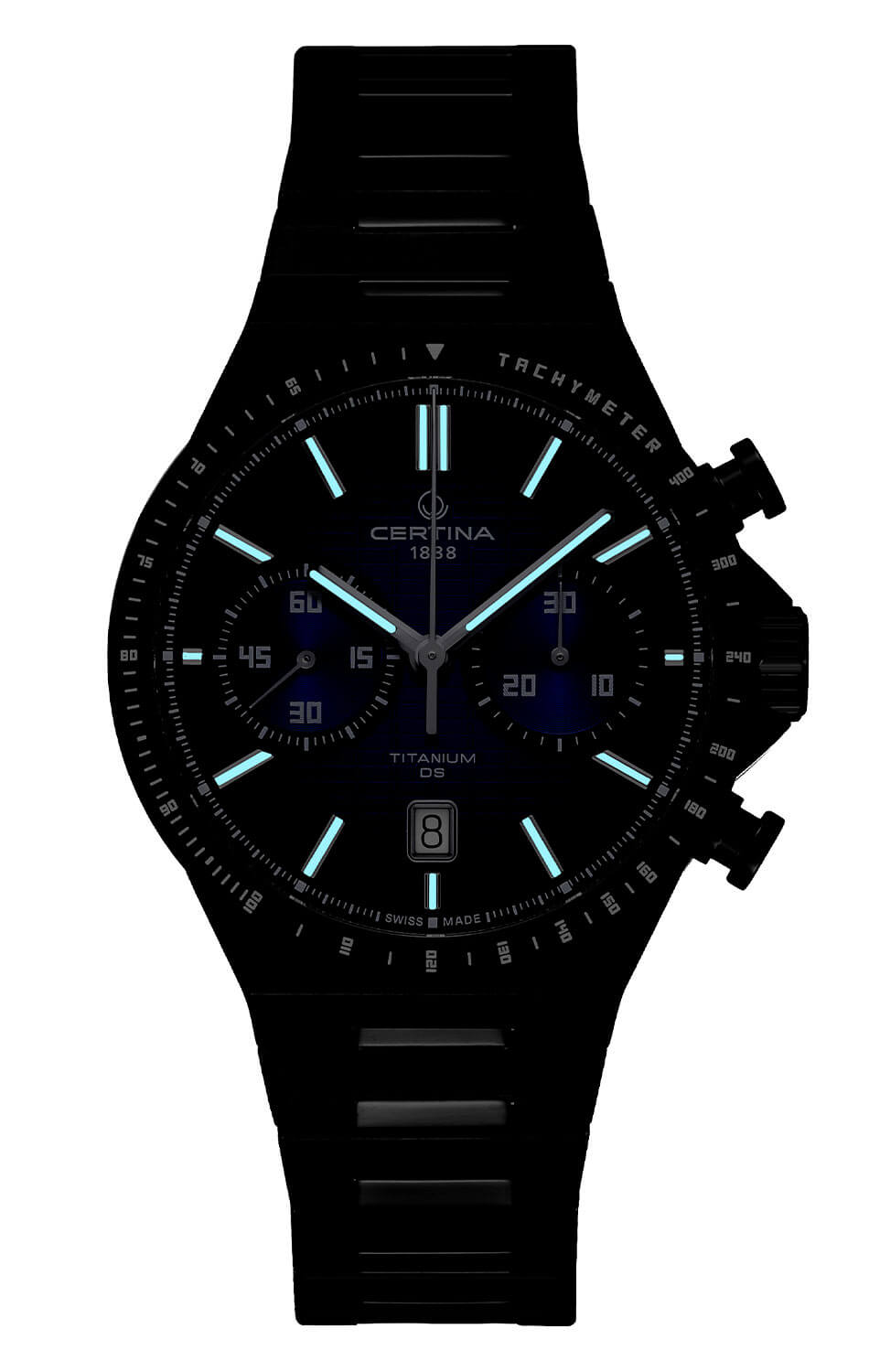 Titanové pouzdro o průměru 42 mm je opatřeno černým PVD povlakem, který konstrukci dodává výraz, aniž by ji zatížil. Integrovaný náramek z tvrdého titanu plynule navazuje na pouzdro a zajišťuje kompaktní vzhled. Zvětšená tlačítka typu „grzybek“, chráněná korunka a čitelná tachymetrická stupnice na lunetě dávají hodinkám sportovní, ale elegantní charakter. Vodotěsnost do 100 metrů znamená, že s hodinkami se můžete bez obav ponořit do vody – jde o časoměřič, který nezůstává na břehu.