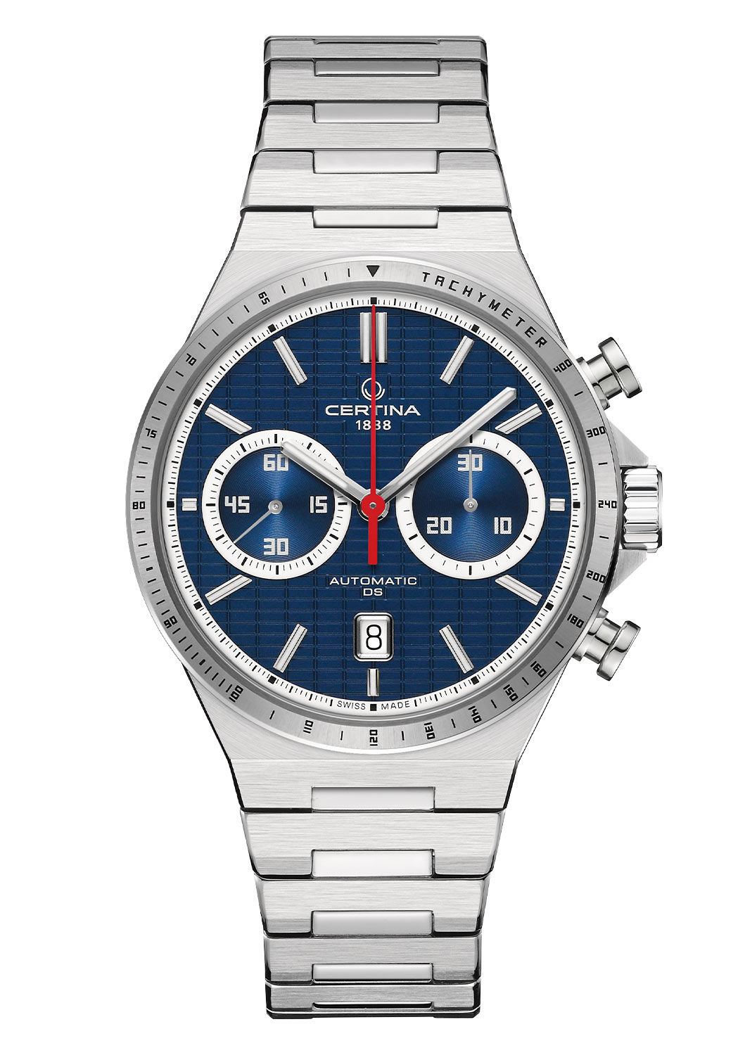 Pod safírovým sklem s antireflexní vrstvou se nachází modrý číselník, zdobený raženou strukturou mřížky, která odkazuje na pravidelný systém linií mřížky a stěn vymezujících hřiště pro pádel. Povlak Super-LumiNova® na ručičkách a indexech zajišťuje optimální čitelnost i ve tmě. Hodinky Certina se pyšní svou funkčností. Na číselníku jsou umístěny dva chronografické subčíselníky. Stopky umožňují přesně měřit čas během sportovních aktivit i v každodenním životě, pokud je to potřeba. Datumovka na šesté hodině zobrazuje aktuální den v měsíci.