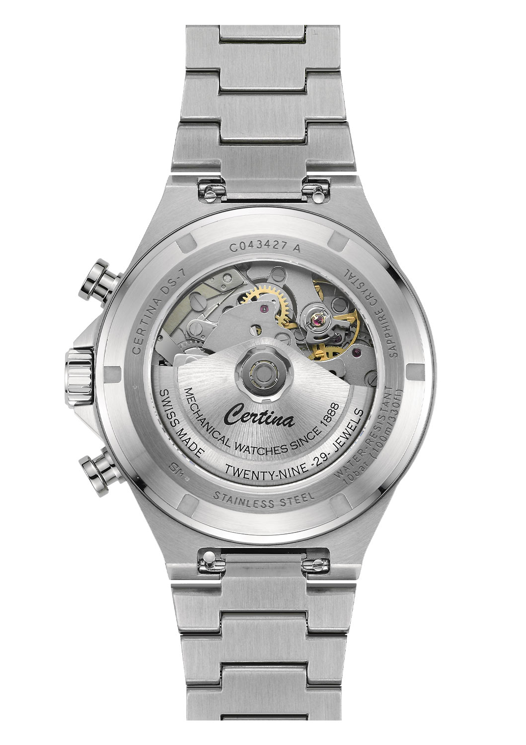 Certina DS-7 Chrono Auto je příkladem hodinek, které dokonale kombinují dynamiku se solidností. Jejich pouzdro o průměru 42 mm, vyrobené z vysoce kvalitní ušlechtilé oceli, nejen přitahuje pohledy, ale také zaručuje odolnost vůči vodě až do 100 metrů. Detaily jako chráněná korunka, elegantní tlačítka ve stylu houbového tvaru a tachymetrická škála vytvářejí ideální harmonii mezi sportovní estetikou a praktickou funkcionalitou. Náramek z moderní, odolné oceli plynule přechází do pouzdra, což zajišťuje nejen jednotný vzhled, ale také maximální komfort nošení na zápěstí. Systém rychlé výměny náramku umožňuje snadné a beznástrojové přizpůsobení časoměru vašemu stylu.