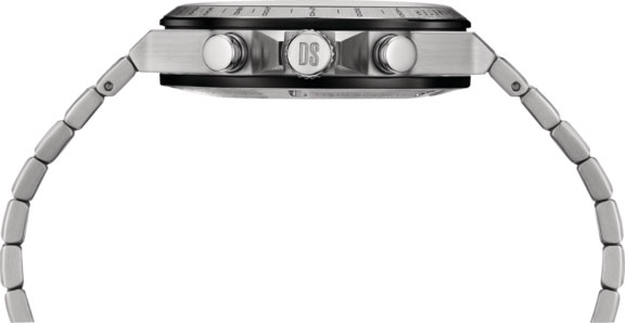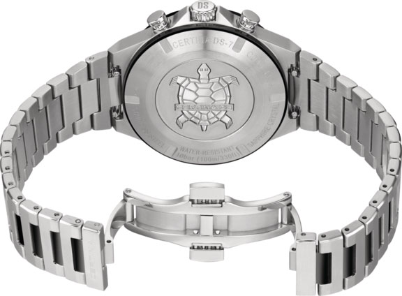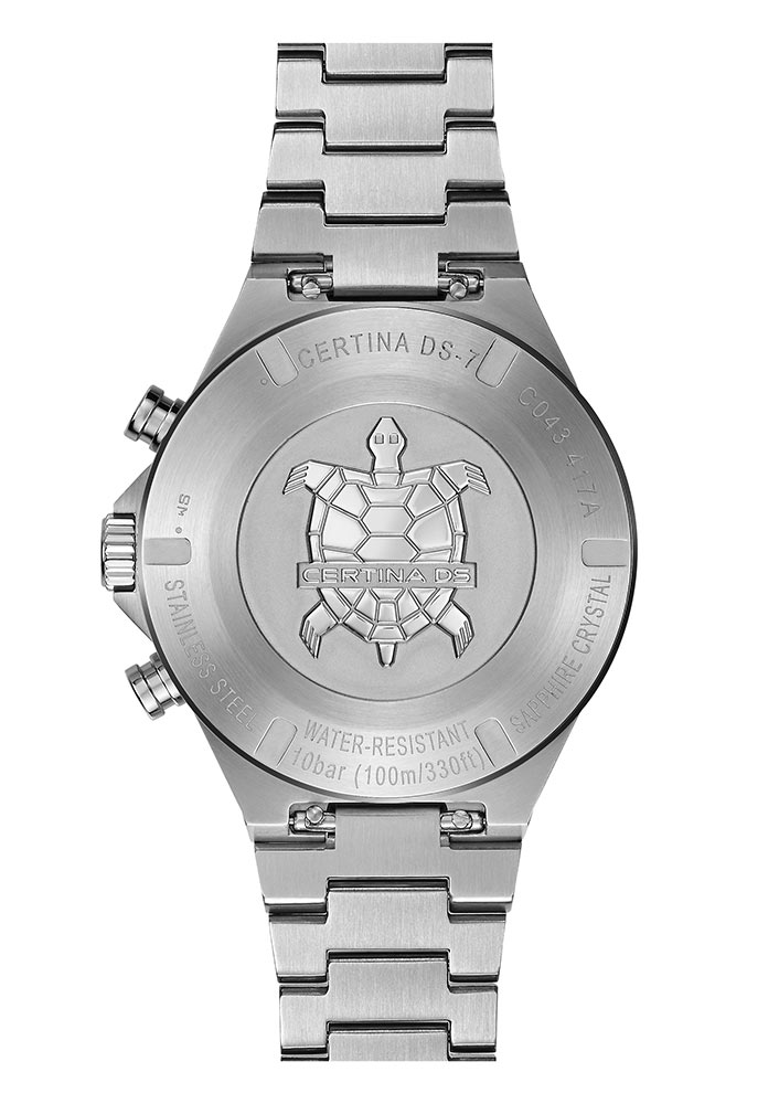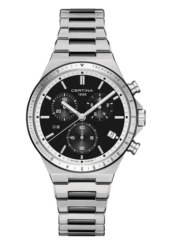 Certina DS-7 Chronograph C043.417.22.051.00 jsou stříbrno-černé pánské hodinky s chronografem a tachymetrickým kroužkem pro jednoduché měření rychlosti. Tyto sportovní hodinky jsou voděodolné do 100 metrů a tlaku 10 ATM a jsou poháněny inovativní technologií Precidrive™. Časomíra díky němu nabízí přesnost skutečného chronometru, protože je zhruba osmkrát až desetkrát přesnější než tradiční quartzové hodinky. Kromě funkce stopek (malá vteřinová ručička a 30minutové počítadlo) a funkce tachometru má Certina DS-7 Chronograph zobrazení data a možnost měřit 1/10 vteřiny v reálném čase. Tato druhá komplikace odráží schopnost měřit desetiny vteřiny, která se provádí na subčíselníku na 2. hod. Tato funkce se aktivuje stisknutím příslušného tlačítka. Po 1 minutě se ručička automaticky zastaví. Chronograf ale stále drží čas na desetiny vteřiny.