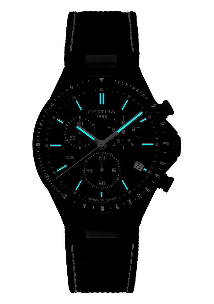 Certina DS-7 Chronograph pro muže na černém řemínku ztělesňuje švýcarskou kvalitu s opravdovým sportovním charakterem, kterou značka dodává již od roku 1888. Certina pro výrobu svých hodinek pečlivě vybírá kvalitní, odolné a spolehlivé materiály. Takové, které splňují standardy pohodlí, estetiky a sportovní linie, které jsou vyžadovány od profesionálních modelů pro každodenní použití. Kulaté pouzdro o průměru 41 mm a motýlková spona látkového řemínku jsou proto vyrobeny z nerezové oceli 316L. Tato vysoce kvalitní slitina je hypoalergenní a zajišťuje jemné ošetření citlivé pokožky. Nerezová ocel je navíc perfektní volbou pro aktivní uživatele, protože je vysoce odolná proti poškrábání a korozi. To zase znamená nejen působivou odolnost hodinek, ale také si dlouhodobě udrží jejich estetický vzhled. Vybrané prvky pouzdra a spony jsou pokryty otěruvzdorným černým PVD povlakem. Funkční ciferník s podsvícenými indexy a ručičkami je krytý safírovým sklem odolným proti poškrábání obohaceným o jednostrannou antireflexní úpravu.