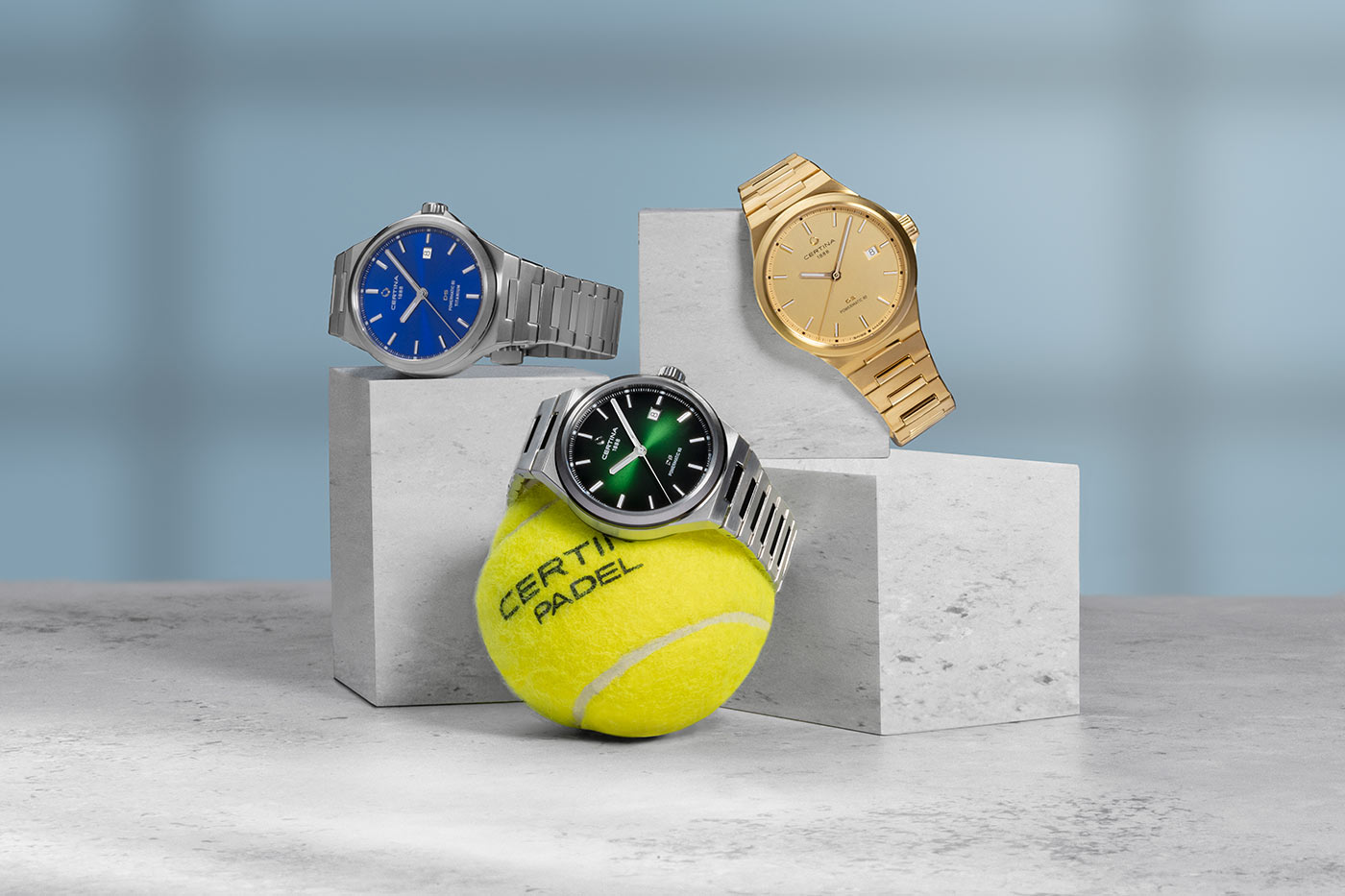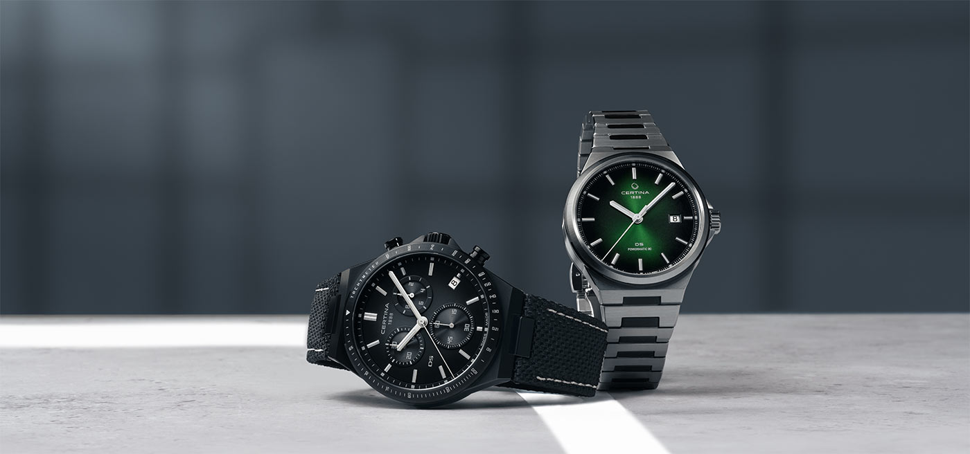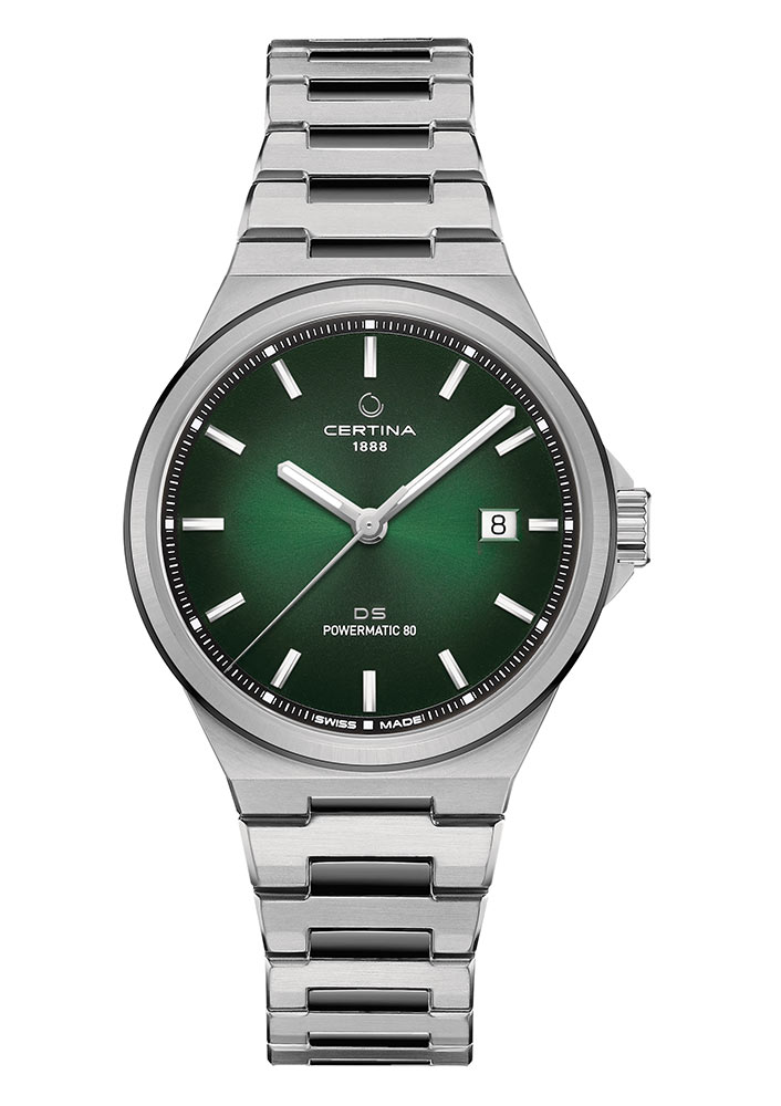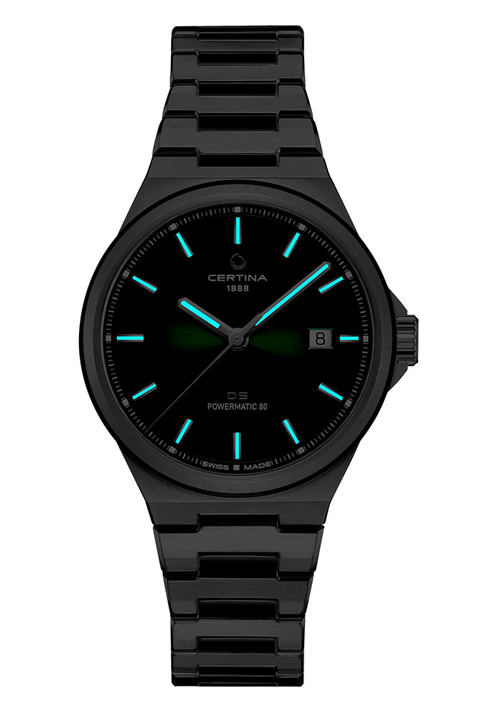 Svěží závan barev na přední straně navozuje ciferník s černo-zeleným gradientním zdobením a solárním brusem. Tato úprava atraktivně koresponduje s černými PVD články náramku. Charakteristické indexy a ručičky zaručují čitelnost, která díky Swiss Super-LumiNova® light povlaku zůstává zachována i ve tmě. Minimalistické datumové okno ve tři hodiny poskytuje pohodlný přístup k informacím o aktuálním datu. Celé to chrání safírové sklíčko odolné proti poškrábání s antireflexní vrstvou. Hodinky Powermatic 80 Certina DS7 jsou novou kapitolou současného sportovního stylu a závanem čerstvého vzduchu v tradiční řadě sportovních hodinek Certina.