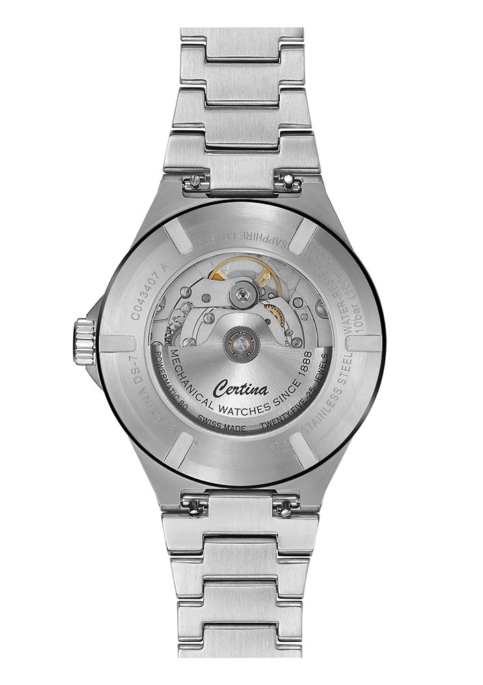Sportovní hodinky s dvoubarevným náramkem Certina DS-7 jsou poháněny vysoce výkonným mechanismem Powermatic 80 s antimagnetickou vlásenkou Nivachron™. Rezerva chodu tohoto kalibru je přibližně 80 hodin, což dává přes 3 dny přesného měření času, když hodinky zůstanou v klidu. Jeho práci a konstrukci lze obdivovat přes šroubovací záda pouzdra s průhledným okénkem ze safírového skla.