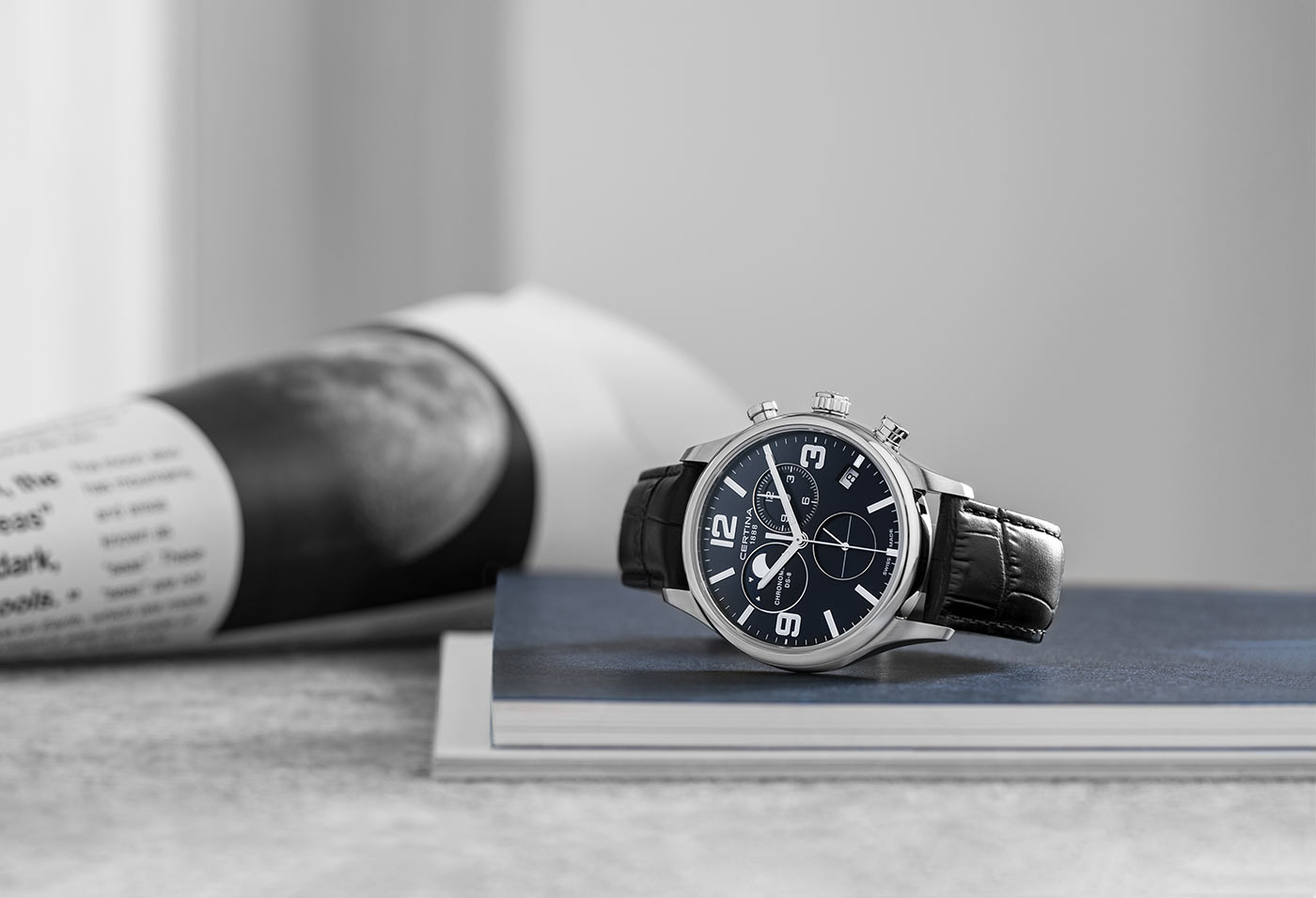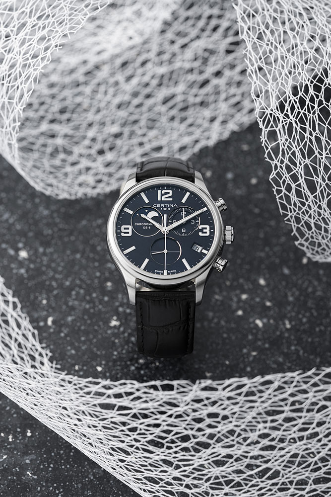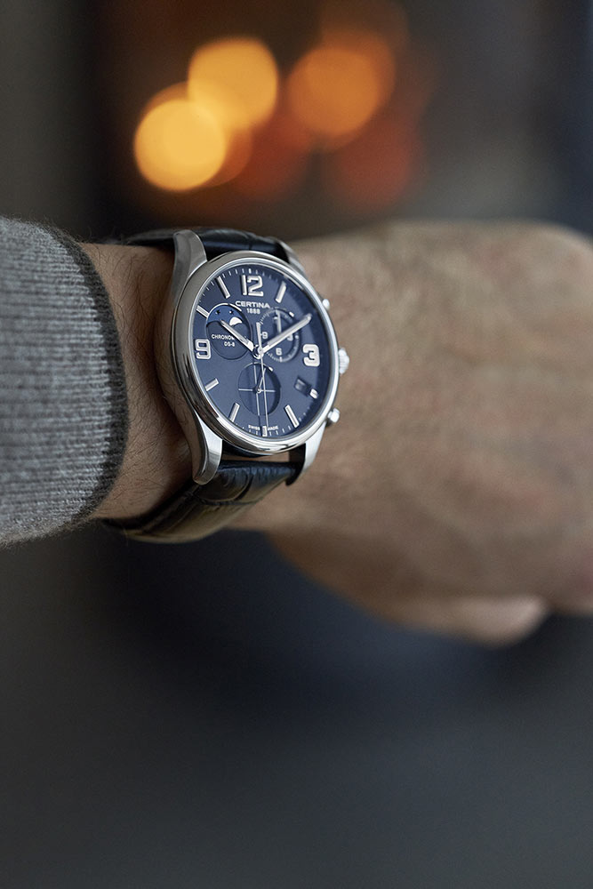 Měsíční chronograf DS-8 s quartzovým Machinekem ETA G10.962 Precidrive™ poskytuje nejen přesný čas s certifikací COSC, ale také užitečné funkce. Chronograf, tedy stopky a krásně vyobrazené fáze měsíce na zdobeném ciferníku v deset hodin. Certina umístila datumovku na 4 hod. Další užitečnou funkcí je indikátor EOL baterie. Při vybití baterie začne sekundová ručička skákat každé 4 sekundy a tím nás informuje, že zhruba za 2 týdny se hodinky zastaví kvůli vybité baterii. DS-8 Chronograph Moon Phase je elegance, preciznost, všestrannost a unikátní hodinky pro elegantního muže, který hledá hodinky, které budou dobře fungovat i na denní bázi.