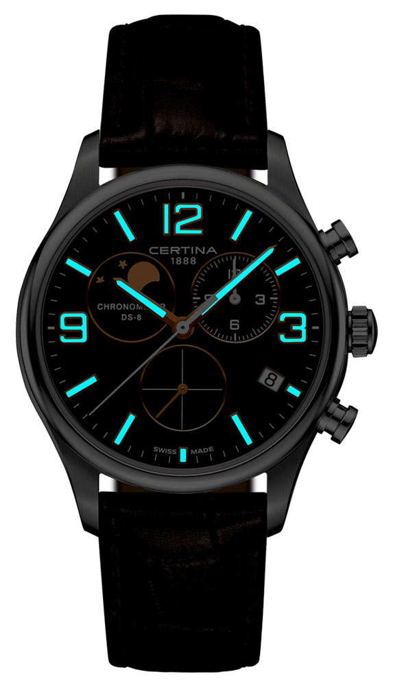 Měsíční chronograf DS-8 s quartzovým Machinekem ETA G10.962 Precidrive™ poskytuje nejen přesný čas s certifikací COSC, ale také užitečné funkce. Chronograf, tedy stopky a krásně vyobrazené fáze měsíce na zdobeném ciferníku v deset hodin. Certina umístila datumovku na 4 hod. Další užitečnou funkcí je indikátor EOL baterie. Po vybití baterie začne sekundová ručička naskakovat každé 4 sekundy a tím nás informuje, že zhruba za 2 týdny se hodinky zastaví kvůli vybité baterii. DS-8 Chronograph Moon Phase je elegance, preciznost, všestrannost a unikátní hodinky pro elegantního muže, který hledá hodinky, které budou dobře fungovat i na denní bázi.