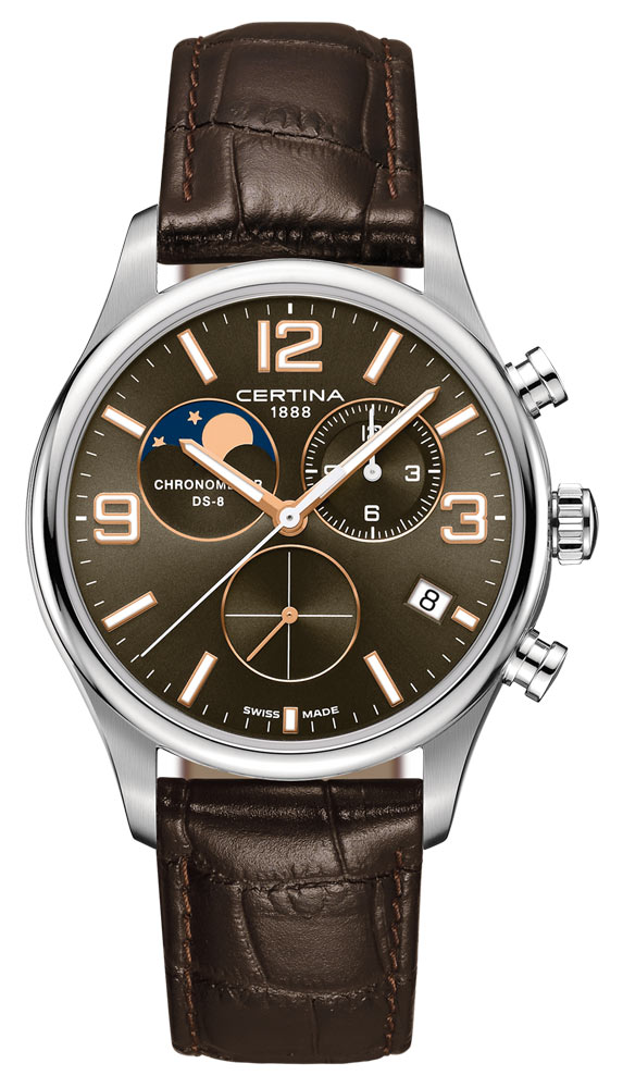 Certina DS-8 Chronograph Moon Phase C033.460.16.087.00 klasické hodinky pro muže se sportovním charakterem. Kulaté pouzdro o průměru 42 mm s matnými očky na horní straně a leštěnými stranami a leštěnou lunetou ve vysokém lesku. Hnědý ciferník skrytý pod safírovým sklem zdobí velké arabské a obdélníkové indexy. Pro osvětlení ciferníku ve tmě Certina použila Super-LumiNova. Nejkvalitnější svítící materiál používaný v současnosti ve švýcarském hodinářství.