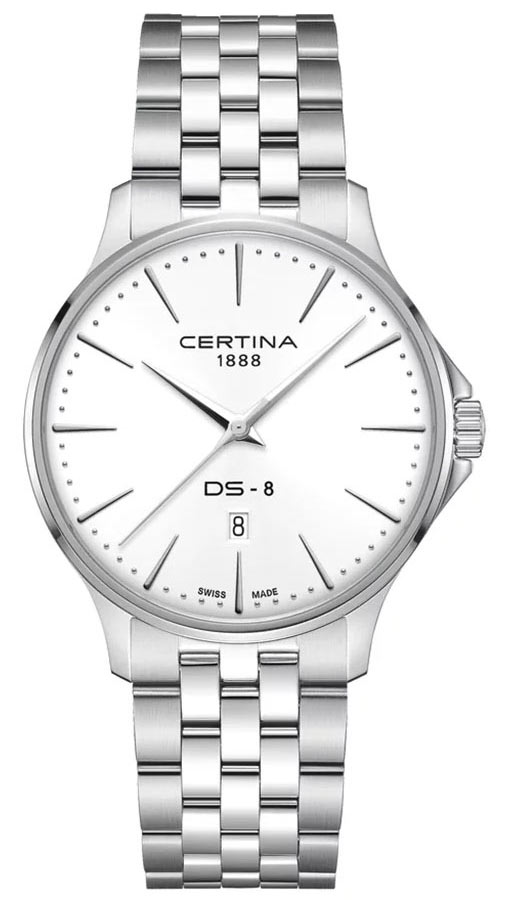 Zepředu na pouzdře je naneseno odolné proti poškrábání safírové sklíčko s antireflexní vrstvou. Chrání stříbrný minimalistický ciferník s elegantními ručičkami a indexy. Na ciferníku lze spatřit pouze hrdé logo značky Certina 1888, název kolekce DS-8 a datumovku na šesté hodině. Okénko, které zvyšuje funkčnost těchto hodinek, ukazuje aktuální den v měsíci. Pod ciferníkem je nainstalován švýcarský mechanizmus ETA Precidrive™, který zajišťuje spolehlivou přesnost. ETA Swiss Made je vybavena funkcí EOL. End Of Life je informace o nutnosti výměny baterie, která pohání mechanizmus — sekundová ručička změní svůj chod a bude přeskočovat indexy každých několik sekund.