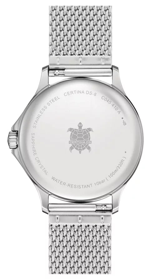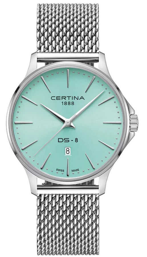 Zepředu na pouzdře je naneseno odolné proti poškrábání safírové sklíčko s antireflexní vrstvou. Chrání světle modrý minimalistický ciferník s elegantními ručičkami a indexy. Na ciferníku lze spatřit pouze hrdé logo značky Certina 1888, název kolekce DS-8 a datumovku na šesté hodině. Okénko, které zvyšuje funkčnost těchto hodinek, ukazuje aktuální den v měsíci. Pod ciferníkem je nainstalován švýcarský mechanizmus ETA Precidrive™, který zajišťuje spolehlivou přesnost. ETA Swiss Made je vybavena funkcí EOL. End Of Life je informace o nutnosti výměny baterie, která pohání mechanizmus — sekundová ručička změní svůj chod a bude přeskočovat indexy každých několik sekund.
