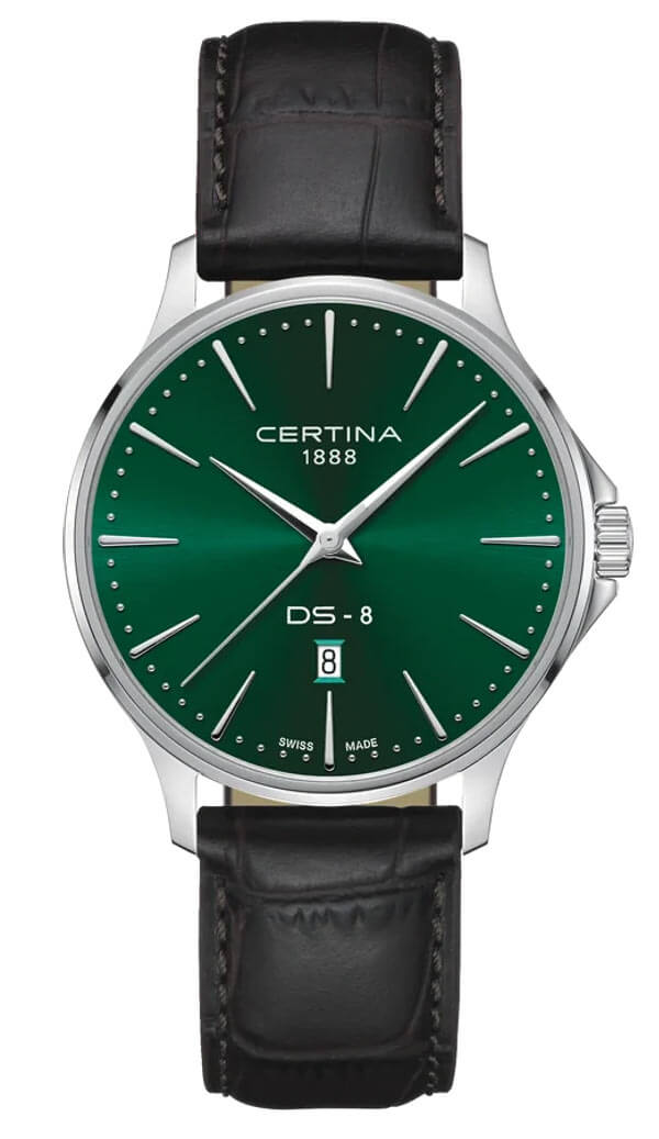 Elegance v čisté podobě – tak lze nejjednodušeji popsat pánské hodinky Certina DS-8 Gent C045.410.16.091.00. Jsou navrženy pro muže, kteří dávají přednost vytříbené jednoduchosti, ale zároveň očekávají výrazný charakter v doplňcích. Minimalistický zelený ciferník se štíhlými indexy a černý kožený řemínek zajišťují, že se hodinky skvěle hodí k obleku, a zároveň se dokážou nenápadně odlišit i v méně formálních stylech. Řemínek je vybaven systémem rychlé a beznástrojové výměny, což usnadňuje přizpůsobení jiného řemínku v libovolné barvě podle potřeby a stylu. Nadčasová klasika, v níž je každý detail podřízen harmonii tvaru a funkčnosti.