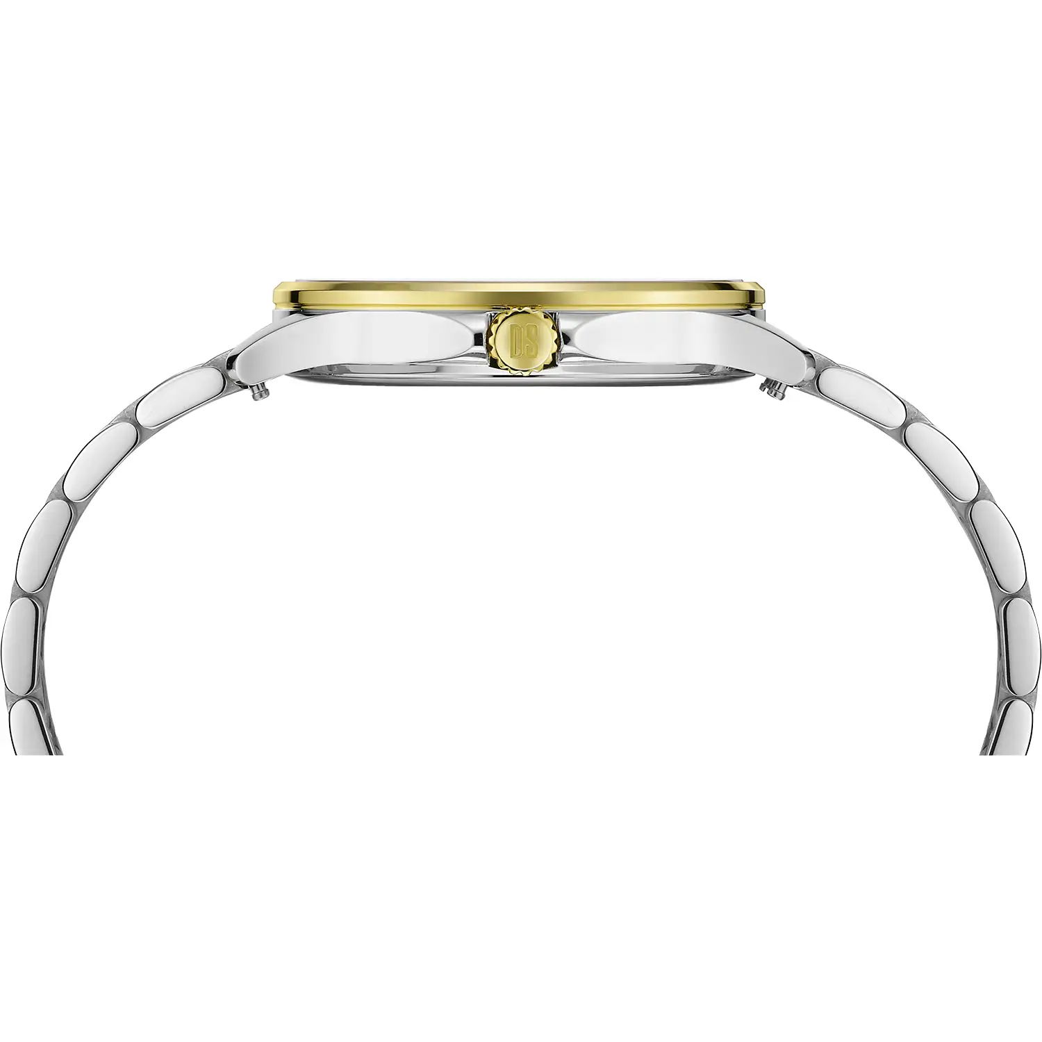 Stříbrný ciferník s jemnou paprskovitou úpravou typu sunray ladí se zlacenými indexy a ručkami a zachovává čitelnost i eleganci bez zbytečných ozdobných prvků. Datumovka umístěná na šesté hodině nenápadně organizuje kompozici a zvyšuje funkčnost modelu. Pod ciferníkem pracuje švýcarský strojek ETA Precidrive™, známý nadprůměrnou přesností a funkcí EOL signalizující nízkou úroveň baterie. Jsou to hodinky, které spojují přesnost Swiss Made s nadčasovým stylem a budou přirozenou volbou pro muže, který si cení kvality v její nejčistší podobě.