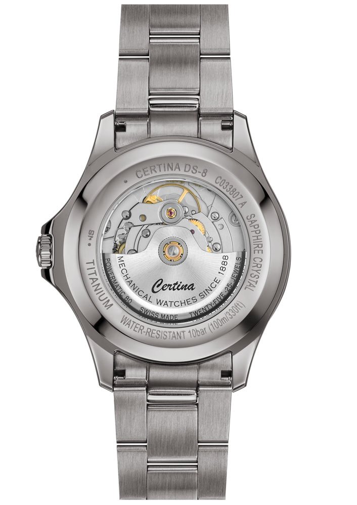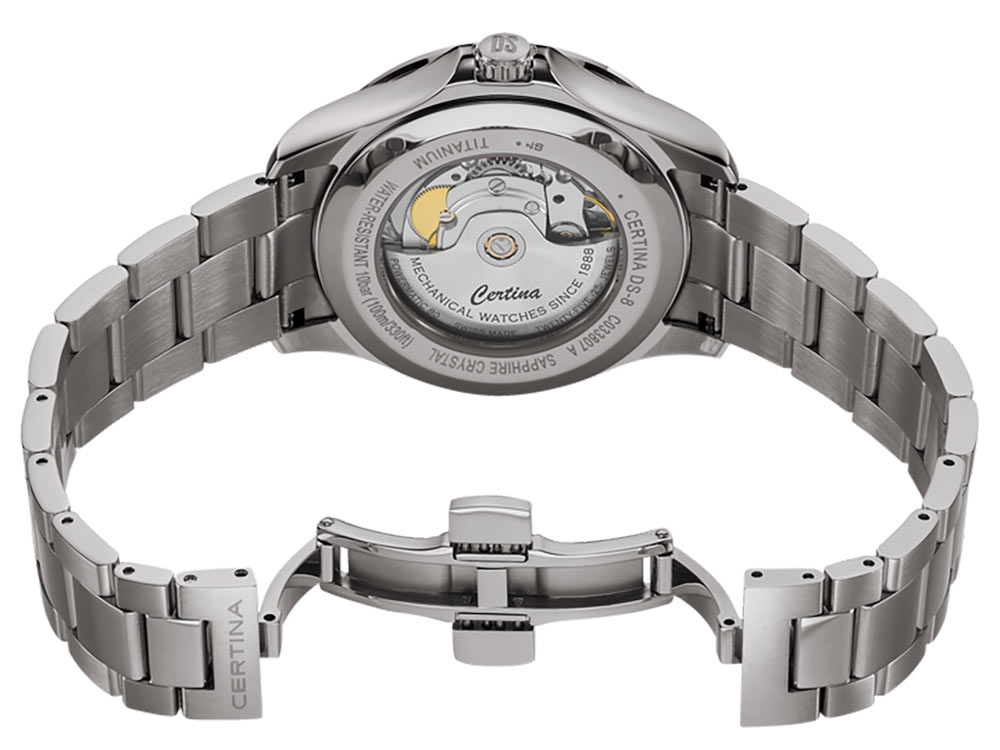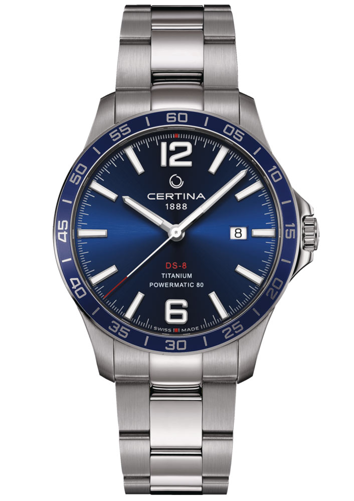 DS-8 je zábavný s barvami, s modrým ciferníkem zdobeným bílými a červenými akcenty. Silná vrstva Super-LumiNova® na ručičkách, číslicích a ukazatelích hodin zajišťuje optimální čitelnost i ve tmě a datumové okénko ve 3 hodiny dokonale doplňuje číselník. Moderní automatický Machineek Powermatic 80.611 skrytý uvnitř pouzdra zajišťuje spolehlivou přesnost. Kromě rezervy chodu až 80 hodin jsou hodinky vybaveny zcela novým typem balanční pružiny ze slitiny Nivachron™ . Tento inovativní materiál byl vyvinut ve spolupráci se Swatch Group pro zvýšení odolnosti hodinek vůči magnetickým polím. Certina je nyní jednou z prvních značek, která tento nový materiál používá. Vzhledem k tomu, že slitinový základ tvoří titan a křemík, vlásenka Swiss Made také vykazuje vysokou odolnost vůči teplotním výkyvům a vynikající rázovou houževnatost. Celkově vzato, šedesát let po uvedení systému Double Security na trh nejnovější verze DS-8 opět nastavuje nový standard spolehlivosti.