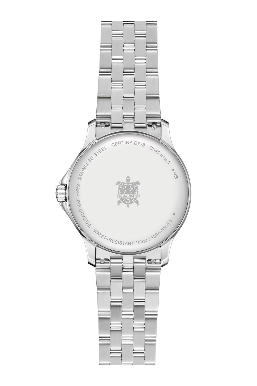 Pouzdro o průměru 31 mm je vyrobeno z odolné ušlechtilé oceli a spojeno s ocelovým náramkem s harmonickými liniemi. Díky tomu hodinky nejen elegantně vypadají na zápěstí, ale také poskytují pohodlí a odolnost při každodenním nošení. Číselník je chráněn safírovým sklíčkem s vnitřní antireflexní vrstvou, která zajišťuje vynikající čitelnost a odolnost proti poškrábání. Na zadním víčku je vygravírován symbol želvy – znak systému DS a symbol solidní, certifikované konstrukce. Voděodolnost do 100 metrů je praktickým bonusem, díky kterému lze hodinky bez obav používat i při aktivitách ve vodě.