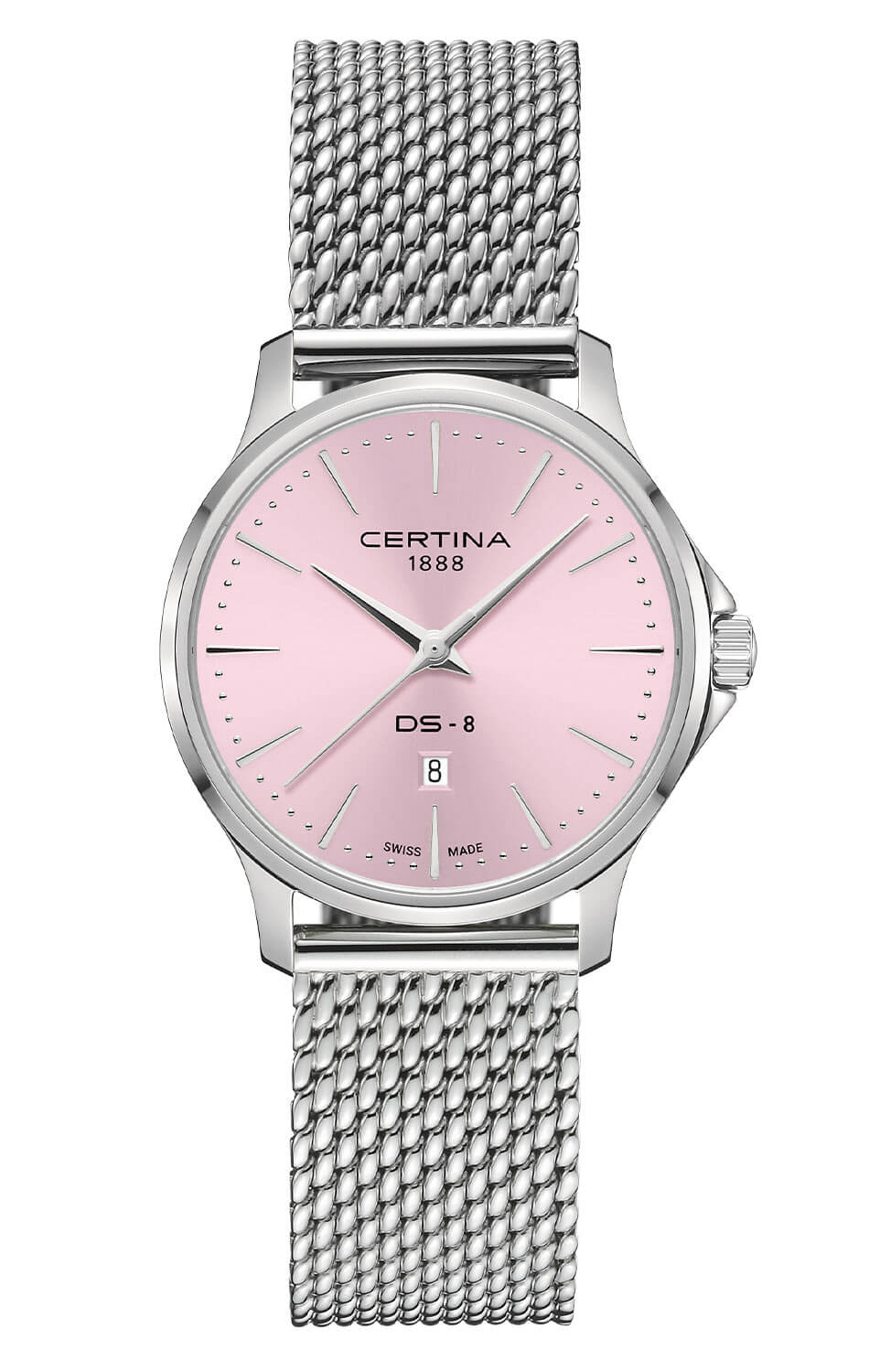 Kvartzové hodinky Certina DS-8 Lady 31mm nejsou jen funkční, ale také stylové. Elegantní a ergonomický náramek typu mesh z nerezové oceli s rychlou výměnou umožňuje snadnou personalizaci. Skládací přezka s motýlími křidélky na dva tlačítka zaručuje bezpečné a pohodlné nošení. Dva typy povrchových úprav, kartáčovaný a leštěný, zvyšují atraktivitu designu a usnadňují vizuální rozlišení jednotlivých částí pouzdra. Růžový ciferník se slunečním efektem má šipky typu Dauphine a aplikované kuželové indexy, které mu dodávají eleganci. Je také možné provést gravírování na zadní straně, což z těchto hodinek činí vynikající dárek nebo osobní památku. Certina DS-8 Lady je ideální kombinací elegance, odolnosti a modernosti, která uspokojí i ty nejnáročnější zákaznice.