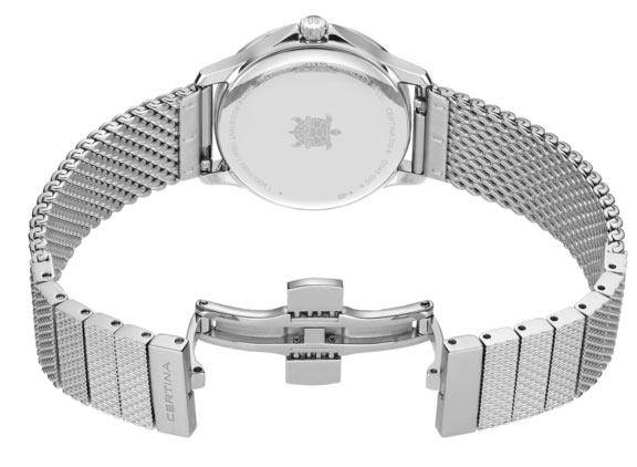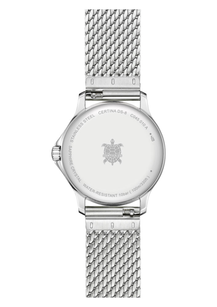 Stříbrné dámské hodinky Certina DS8 Lady se vyznačují rozmanitostí použitých materiálů a atraktivní cenou. Tenká (7,95 mm tloušťka) ocelová pouzdra poskytuje odolnost proti korozi a poškrábání a zároveň antialergenní vlastnosti kůže. Dále disponuje systémem dvojité ochrany Double Security (DS Concept), který je od roku 1959 symbolem maximální odolnosti Certiny. Díky voděodolnosti až 10 barů (100 metrů) a krytu korunky bude Certina C045.010.11.331.00 skvělým společníkem v různých podmínkách, od každodenních aktivit až po extrémní výzvy.