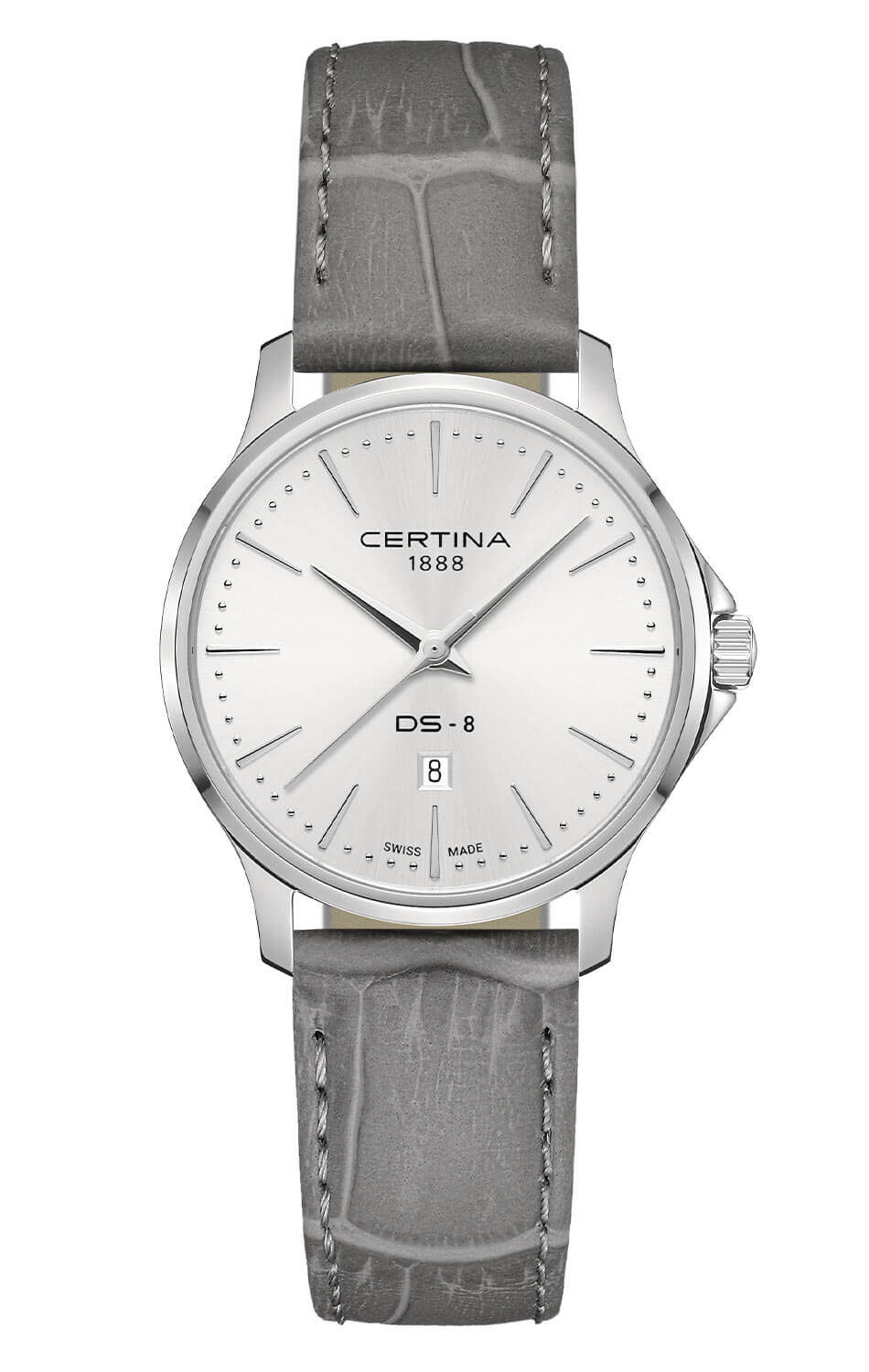 Quartzové hodinky Certina DS-8 Lady 31mm nejsou jen funkční, ale i stylové. Šedý řemínek z přírodní kůže s texturou krokodýlí kůže a sponou typu přezka má systém rychlé výměny, který umožňuje snadnou personalizaci. Stříbrný ciferník se sluneční úpravou má ručičky Dauphine a aplikované klínové indexy, které dodávají hodinkám eleganci. Je zde také možnost gravírování na zadní straně pouzdra, což činí tento časoměr ideálním dárkem nebo osobní památkou. Certina DS-8 Lady je dokonalou kombinací elegance, odolnosti a modernosti, která uspokojí i ty nejnáročnější zákaznice.