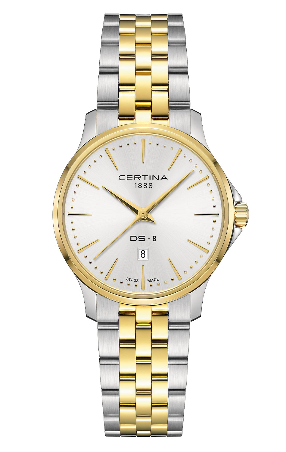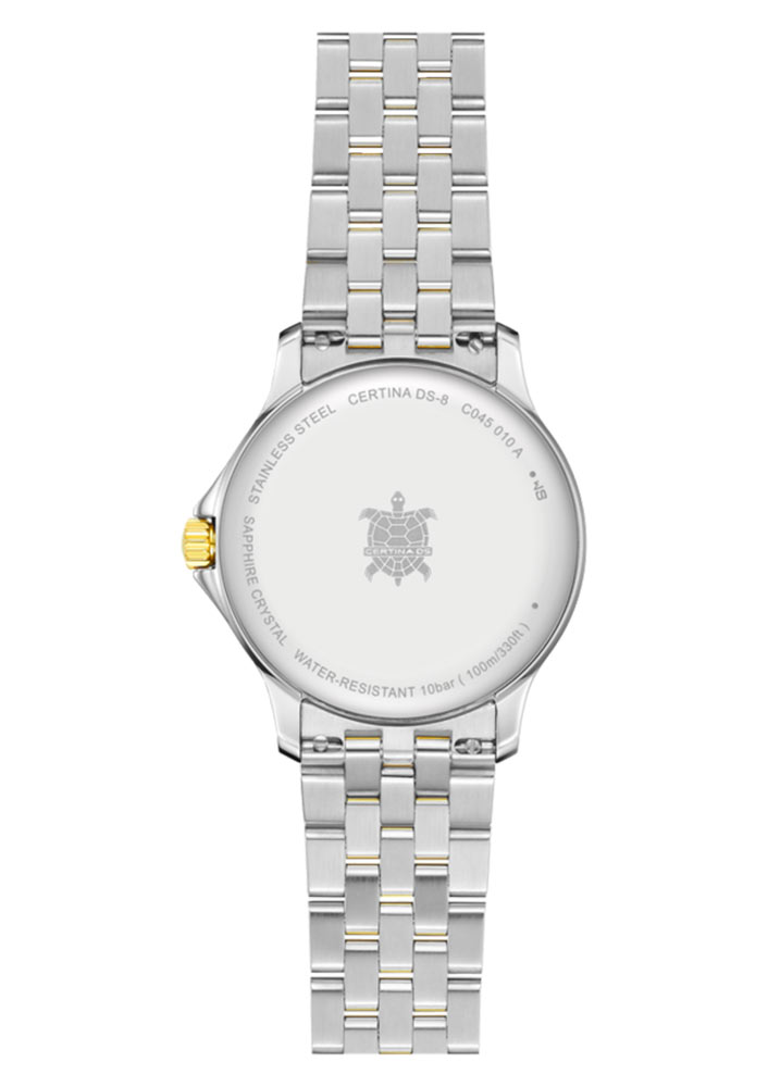 Stříbrně-zlaté dámské hodinky Certina DS8 Lady se vyznačují různorodostí použitých materiálů a atraktivní cenou. Tenká (7,95 mm tloušťka) pouzdro je částečně pozlacené PVD nerezovou ocelí, což zajišťuje lesk, odolnost proti korozi a poškrábání a také alergický vztah k pokožce. Kromě toho mají systém dvojité ochrany Double Security (DS Concept), který od roku 1959 symbolizuje maximální pevnost značky Certina. Díky vodotěsnosti do 10 barů (100 metrů) a ochraně korunky se Certina C045.010.22.031.00 skvěle osvědčí v různých podmínkách, od běžných aktivit po extrémní výzvy.