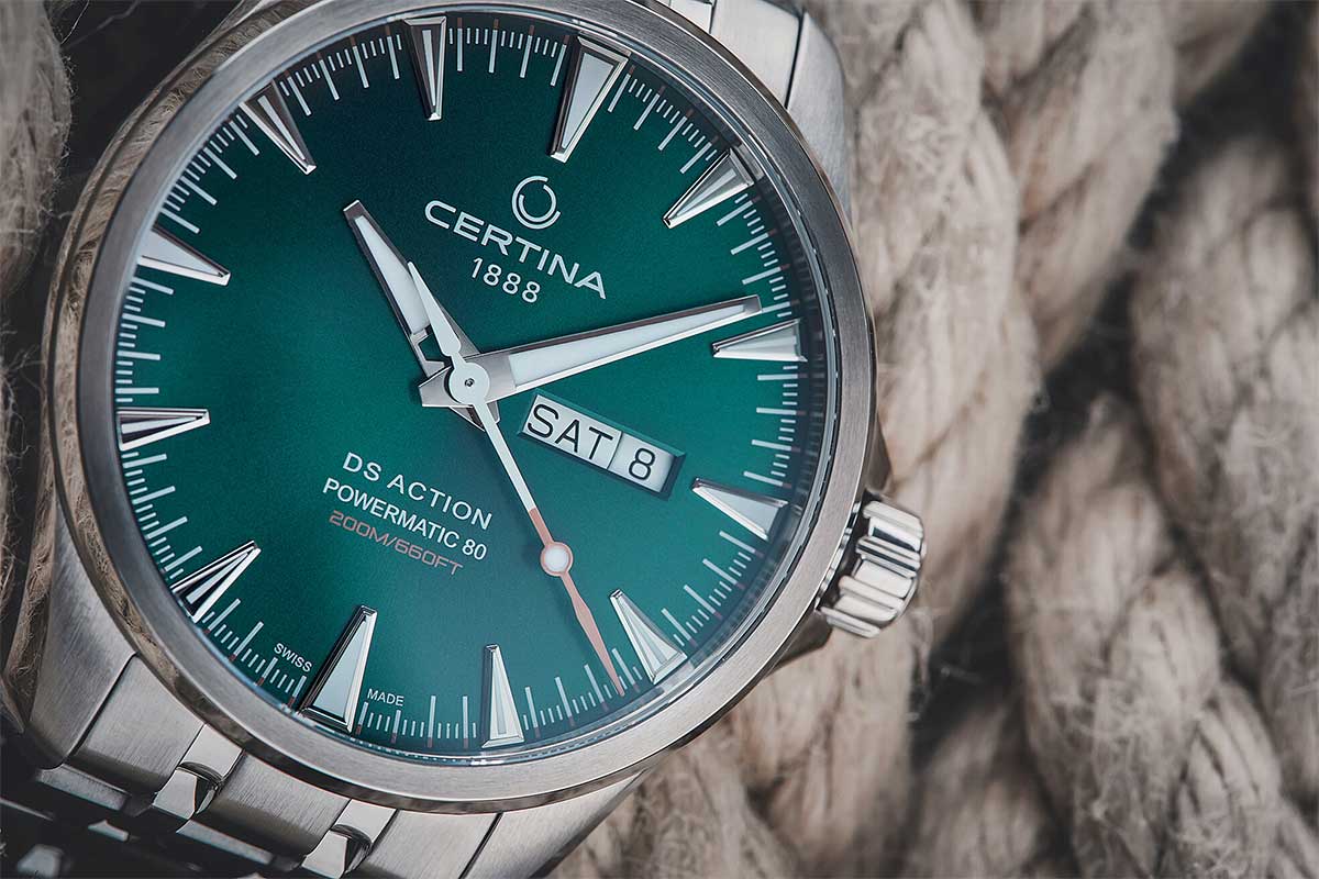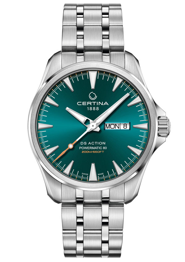 Bez falešné skromnosti nemají pánské hodinky Certina DS Action Big Date Powermatic 80 C032.430.11.091.00 co skrývat. Naopak. Odvážně prezentuje to, co nabízí. Například - přehledné, velké datumové okno s dnem v týdnu a měsícem a velmi dobře čitelnými ručičkami a indexy. Tyto extrémně robustní hodinky jsou voděodolné do 20 barů a vždy upoutají pozornost toho, co je důležité. Stylové hodinky uzavřené v nerezovém pouzdře o průměru 41 mm. Ručičky a indexy Super-LumiNova® svítící ve tmě vynikají na slunném zeleném ciferníku. Velké datumové okénko ve 3 hodiny také poskytuje vynikající přehlednost a čitelnost. Oranžový hrot sekundové ručičky a nápis na číselníku dodávají nádech sportovního designu. Srdcem hodinek je moderní Powermatic 80, automatický kalibr s 80hodinovou rezervou chodu. Sportovní, elegantní vzhled skrývá skutečnou sílu: Osvědčený koncept Double Security DS , šroubovací zadní část pouzdra a zajištěná šroubovací korunka kombinují nekompromisní odolnost.