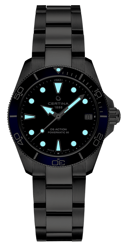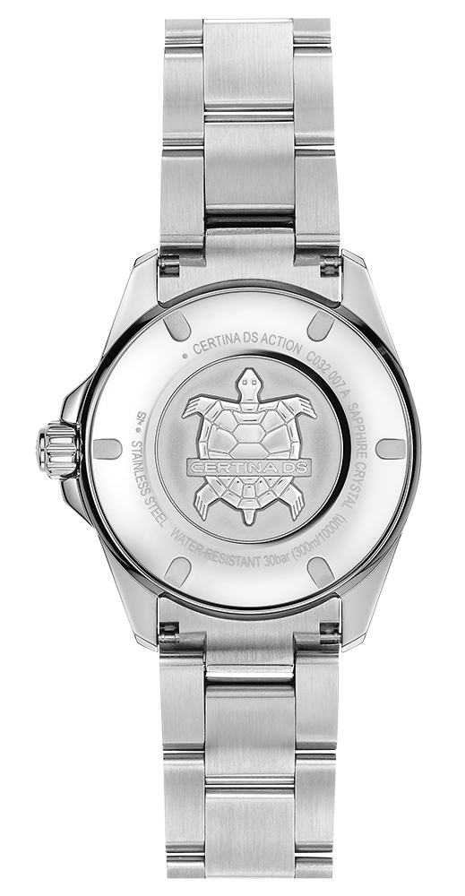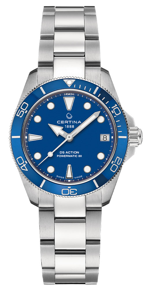 Pouzdro o průměru 34,50 mm je utěsněno na 300 metrů (30 barů). Takto vysoký stupeň těsnosti vám umožňuje potápět se s hodinkami na zápěstí. Těsnost doplňuje šroubovací korunka a šroubovací záda pouzdra. Důležitým prvkem řady hodinek Certina DS je systém Double Security, který je založen na prvcích, které dohromady tvoří ucelený bezpečnostní systém. Vodotěsné a prachotěsné, zeslabující magnetické pole, zpevnění korunky a skla - to zajišťuje systém DS. Na přední straně je otočná luneta s modrým keramickým kroužkem, se stupnicí užitečnou při potápění a fixem na 12 hod. Safírové sklo vysoce odolné proti poškrábání chrání modrý ciferník se snadno čitelnými ručičkami a smíšenými indexy . Ručičky, indexy a stupnice na lunetě jsou vybaveny podsvícením Super-LumiNova pro snadné odečítání času – sledování času ve tmě. Na ciferníku je datumové okénko s aktuálním dnem v měsíci - bylo umístěno na 3. hod. Hodinky byly kombinovány s ocelovým náramkem s bezpečnou a pohodlnou motýlkovou sponou. Náramek má systém rychlé výměny bez dalších náMachineů.