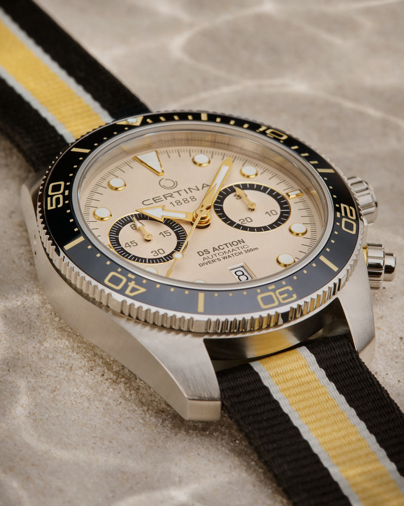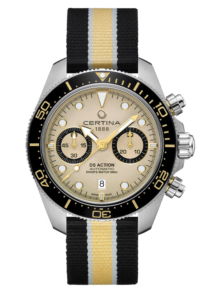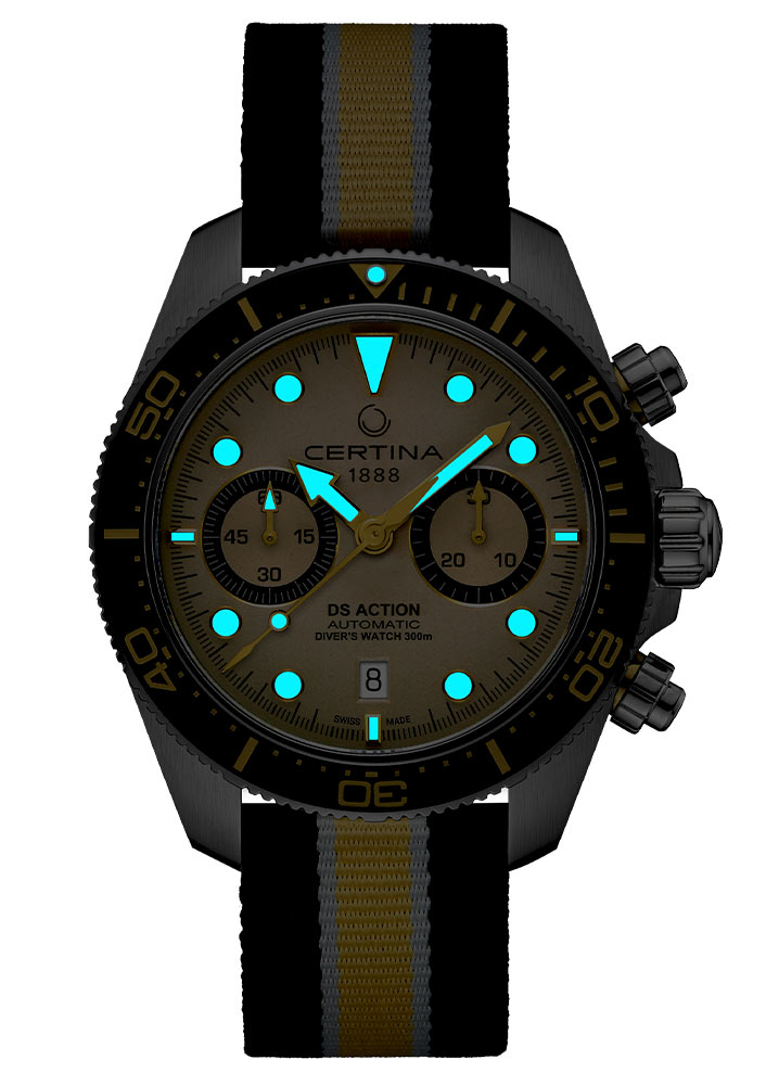 Pánské hodinky Certina DS Action Diver Chrono poutají pozornost i na přímořské promenádě. Matný ciferník v pískově béžovém odstínu kontrastuje s černou lunetou a zlatými ručičkami a dodává hodinkám moderní charakter. Pánské hodinky Certina mají na ručičkách a indexech povrchovou úpravu Super-LumiNova®. Ciferník bude čitelný i při slabém osvětlení. Klíčovou vlastností tohoto modelu je chronograf Bicompax, který nabízí dva počítadla. Totalizéry na třetí a deváté hodině udávají přesné sekundy a minuty. Chronograf je užitečná funkce pro muže, kteří chtějí mít přesný čas. Funkčnost ciferníku doplňuje datumové okénko, které v šest hodin indikuje aktuální den v měsíci. Vše je kryto safírovým sklem vysoce odolným proti poškrábání s antireflexní vrstvou, která odráží světelné paprsky.