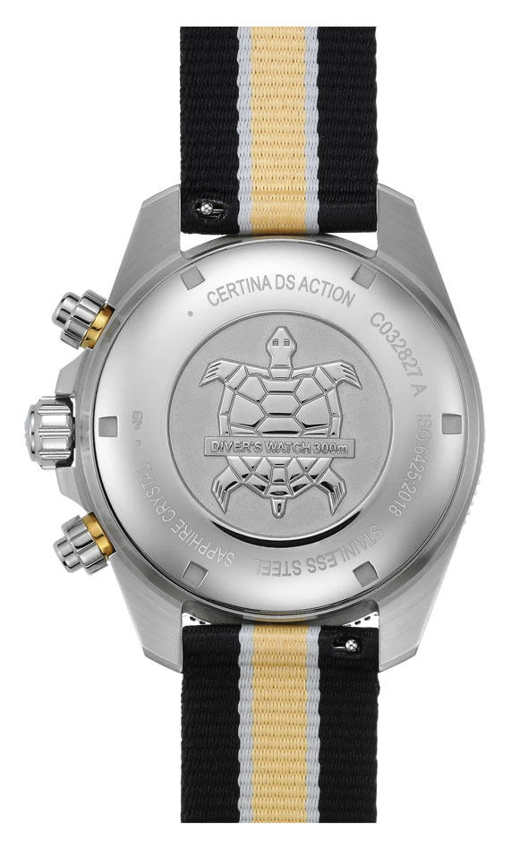 Pánské hodinky Certina DS Action Chrono Diver jsou nabízeny s pánským pouzdrem 44,60 mm. Prezentované potápěčské hodinky Certina Automatic jsou vybaveny řešením založeným na patentovaném konceptu DS (Double Security). Těsnost celé konstrukce je podpořena šroubovací korunkou, šroubovacími tlačítky chronografu a šroubovacím zadním pouzdrem na zadní straně pouzdra. Přední strana pouzdra je vybavena jednosměrnou lunetou s keramickou vložkou, která díky minutové stupnici pomáhá sledovat ubíhající čas například při ponoření. Výrobce svůj potápěčský model zkombinoval s popruhem z elastického materiálu z ekologického #tide ocean material® v černé a béžové barvě. Tento popruh bude výbornou volbou pro fyzické aktivity včetně potápění. Disponují snadným a beznástrojovým systémem výměny, který vám umožní upravit si hodinky podle vlastního stylu a potřeb.