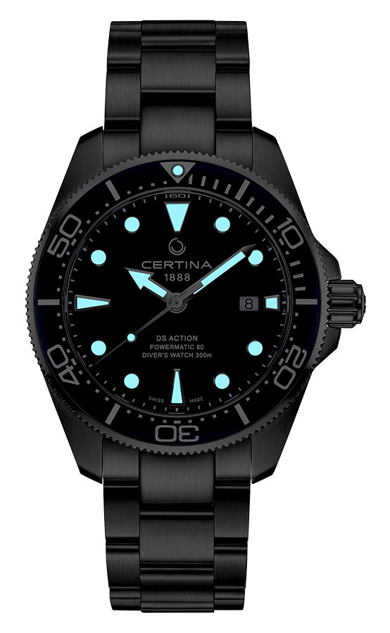 V nejnovější představené verzi dosáhly přednosti celé rodiny diverských hodinek nejvyšší úrovně. Certina DS Action Diver C032.607.11.041.00 byl umístěn ve větším 43mm pouzdru než jeho předchůdce a stejně jako ostatní modely splňuje požadavky omezující normy ISO 6425 pro diverské hodinky. Luneta je vyrobena z keramiky odolné proti poškrábání a elegantně lesklé. Symbolické značky hodin divere a ručičky Broad Arrow jsou vyplněny ve tmě svítícím Super-LumiNova, zatímco modře lakovaný číselník je chráněn nejkvalitnějším safírovým sklem odolným proti poškrábání s antireflexní vrstvou na vnitřní straně. Pouzdro je vyrobeno z nerezové oceli 316L, která poskytuje vynikající a dlouhotrvající ochranu povrchu, v tomto případě s kartáčovanou povrchovou úpravou ve stylu nářadí.