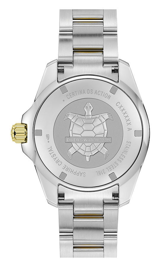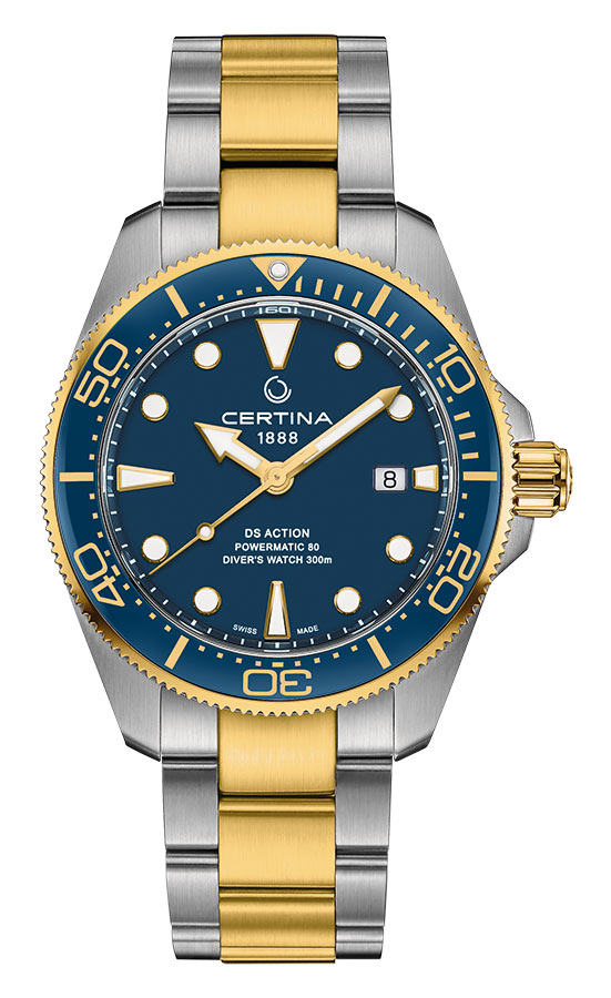 V nejnovější představené verzi dosáhly přednosti celé rodiny diverských hodinek nejvyšší úrovně. Certina DS Action Diver C032.607.22.041.00 byl umístěn ve větším 43mm pouzdru než jeho předchůdce a stejně jako ostatní modely splňuje požadavky omezující normy ISO 6425 pro diverské hodinky. Luneta je vyrobena z keramiky odolné proti poškrábání a elegantně lesklé. Symbolické značky hodin divere a ručičky Broad Arrow jsou vyplněny ve tmě svítícím Super-LumiNova, zatímco modře lakovaný číselník je chráněn nejkvalitnějším safírovým sklem odolným proti poškrábání s antireflexní vrstvou na vnitřní straně. Dvoubarevné pouzdro je vyrobeno z nerezové oceli 316L, která poskytuje vynikající a dlouhotrvající ochranu povrchu, v tomto případě s kartáčovanou povrchovou úpravou ve stylu nářadí. Jednotlivé prvky na ciferníku a lunetě, stejně jako prostřední řada náramku s prodloužením, jsou potaženy PVD vrstvou žlutého zlata pro fanoušky uspokojivého podvodního zážitku, respektive luxusní konferenční atmosféry.
