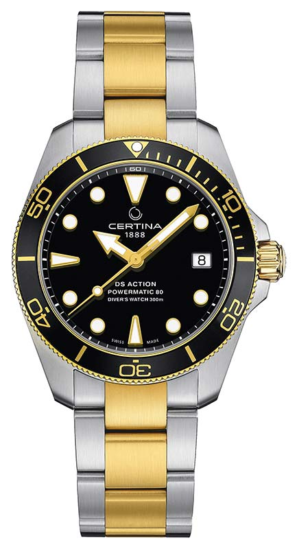 V nejnovější představené verzi dosáhly přednosti celé rodiny hodinek té nejvyšší úrovně. Certina DS Action Diver C032.807.22.051.00 byla umístěna v pohodlném 38mm pouzdru a stejně jako ostatní modely splňuje požadavky omezující normy ISO 6425 pro diverské hodinky. Luneta je vyrobena z lehkého, odolného a hypoalergenního hliníku, který dobře přijímá nanášené pigmenty, díky čemuž kolekce DS Action Diver nabízí hodinky s prsteny až ve 3 barevných variantách!