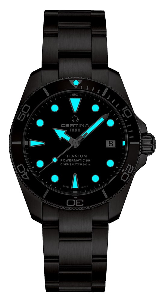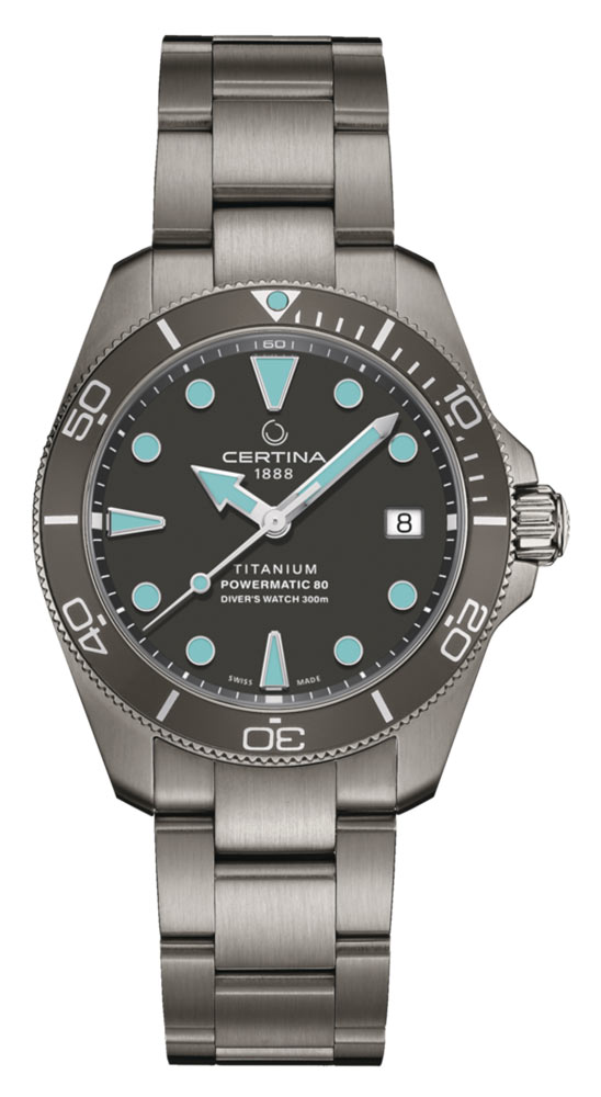 V představené verzi dosáhly přednosti celé rodiny hodinek té nejvyšší úrovně. Hodinky Certina DS Action Diver C0328074408100 jsou umístěny v 38mm titanovém pouzdře a stejně jako ostatní modely splňují požadavky přísné normy ISO 6425 pro diverské hodinky. Kruh dalekohledu je vyroben z lehkého, odolného a hypoalergenního hliníku, který dobře přijímá nanášené pigmenty. Diverské značky hodin a ručičky Broad Arrow jsou vyplněny ve tmě svítícím Super-LumiNova, zatímco ciferník je chráněn nejkvalitnějším safírovým sklem odolným proti poškrábání s antireflexní vrstvou na vnitřní straně. Na uších byl připevněn světle šedý titanový náramek.