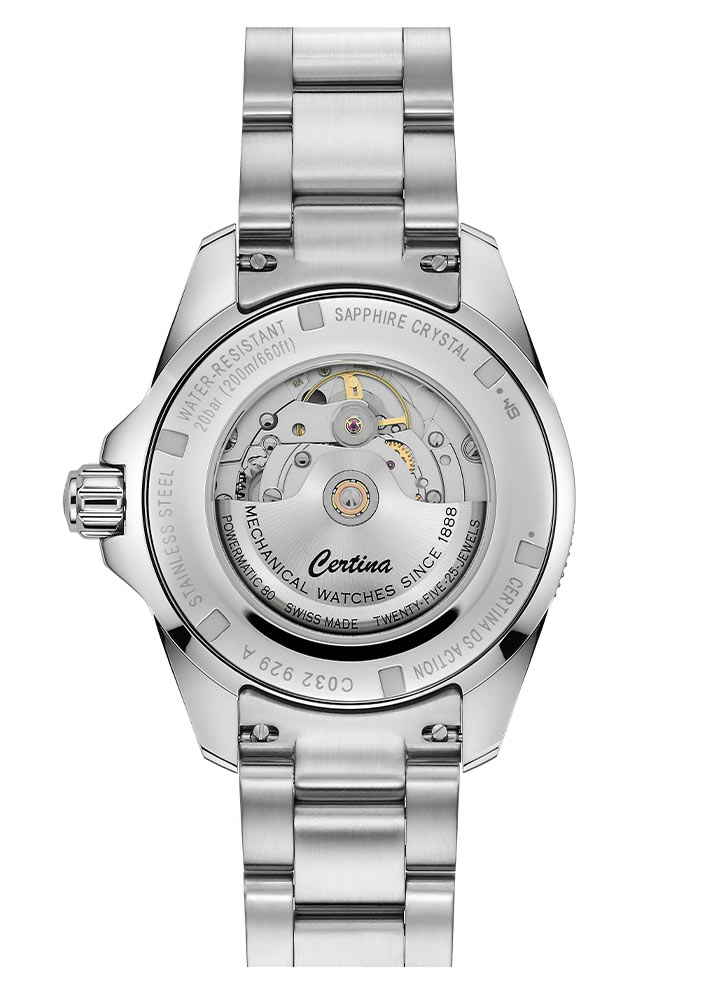 Tyto hodinky vypadají velmi moderně a stylově. Pevné 41mm pouzdro z nerezové oceli je spárováno s ocelovým náramkem. Je vybavena bezpečnou a pohodlnou motýlkovou sponou. Hodinky Certina nabízí inovativní bezpečnostní systém DS (Double Security). Hodinky jsou vybaveny šroubovací, chráněnou korunkou a šroubovací zadní částí pouzdra s vložkou ze safírového skla - to dodává tomuto modelu nejvyšší úroveň odolnosti. Značka Certina se postarala o potřeby fanoušků objevování podmořského světa. Hodinky Certina DS Action jsou vodotěsné do hloubky 200 metrů, což vám umožní bezpečně se potápět.