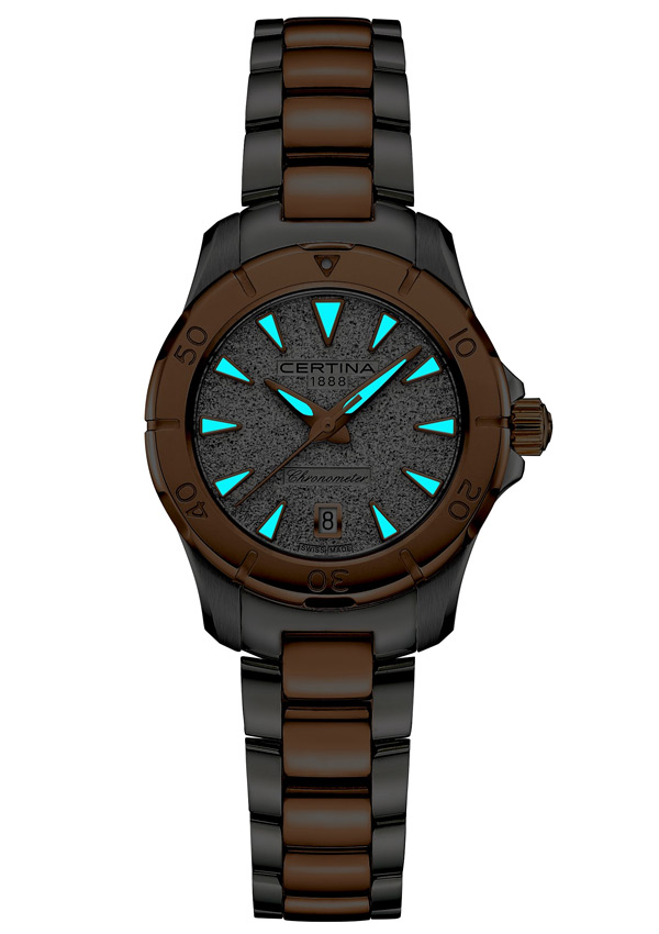 Certina DS Action Lady 29 mm jsou velmi odolné hodinky s vysokou třídou vodotěsnosti 20 bar / 200 m, které umožňují plavání a potápění. Ikonický bezpečnostní systém Certina DS navíc chrání vnitřek hodinek proti polití a otřesům. Šroubovací korunka a zadní část pouzdra jsou další výhodou těchto hodinek. DS Action Lady 29 mm obsahuje nejen diverská řešení. Uvnitř pouzdra měří quartzový Machineek Precidrive™ harmonický rytmus pohybu, stejně přesný nad i pod vodní hladinou. Inovativní technologie Certina, která nyní pohání všechny nové značkové quartzové hodinky, získala prestižní certifikát chronometru švýcarskou laboratoří COSC. COSC stanovuje nejpřísnější požadavky na kvalitu pro moderní měřicí techniky a každé hodinky CERTINA DS Action Lady procházejí rozsáhlým testováním v institutu, než obdrží vlastní oficiální COSC certifikaci.