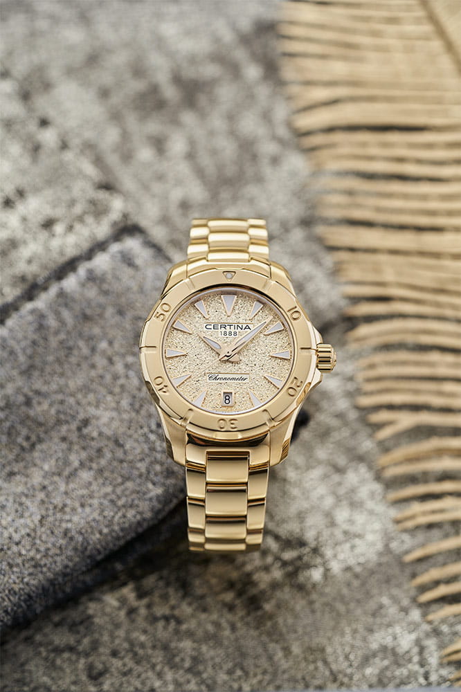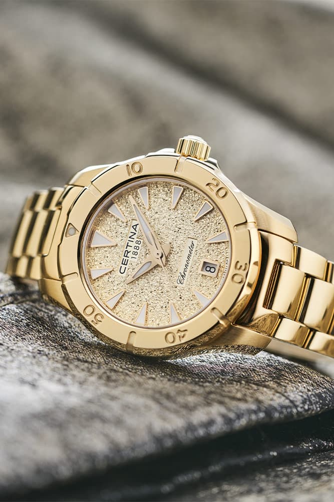 Elegantní verze sportovních hodinek. Certina DS Action Lady C0329513336100 je nejnovější interpretací dámských diverských hodinek z ikonické kolekce DS Action . Krásně zdobené pouzdro o průměru 29 mm s matnými a leštěnými prvky. Na samý vrchol pouzdra Certina umístila otočnou diverskou lunetu v elegantním PVD zlacení. Stejná barva zdobí střed příjemného náramku, který se zapíná na knoflíky.