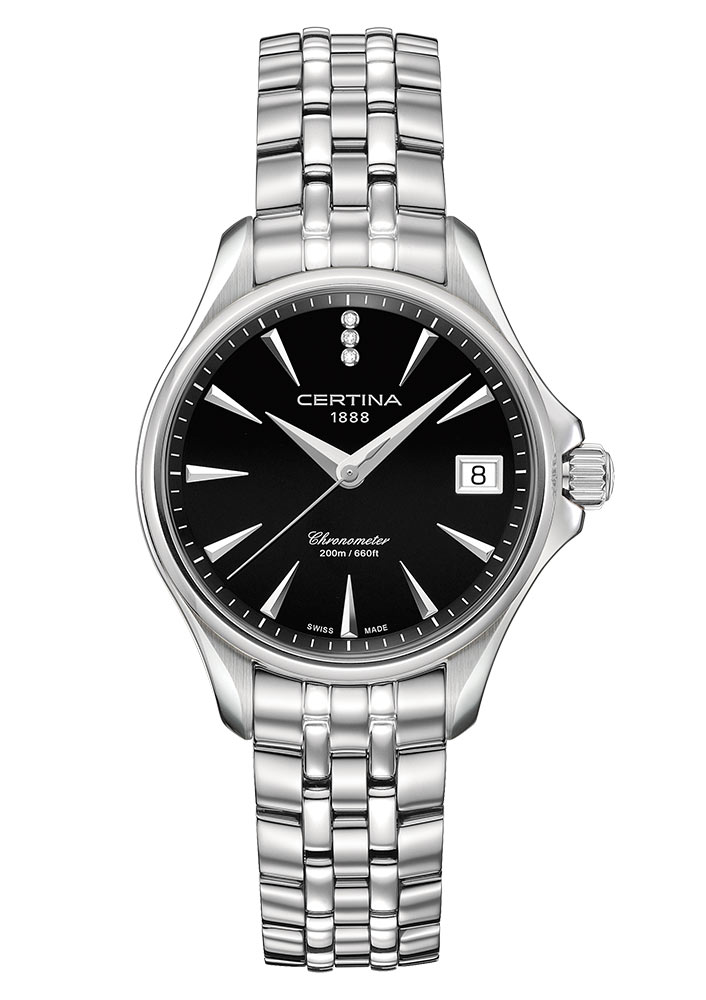 Dámské hodinky Certina DS Action Lady Diamonds Chronometer C032.051.11.056.00 . Univerzální, moderní a krásně vyrobený model DS Action Lady Diamonds je odrazem těch nejlepších vlastností moderní ženy. Bohatý duch a temperament jsou jasně patrné v hodinkách, které jsou podmanivou kompozicí broušených a leštěných ocelových povrchů a čistých a geometrických forem. Ciferník chráněný safírovým sklíčkem proti poškrábání s vnitřní antireflexní vrstvou zdobí tři třpytivé diamanty umístěné nad sebou na 12 hod. Certina používá k dekoraci pouze diamanty Top Wesselton , tedy ty s nejčistšími, zcela průhledná barva. Tento sportovně elegantní model s luxusním nádechem je dokonalým doplňkem každého outfitu.