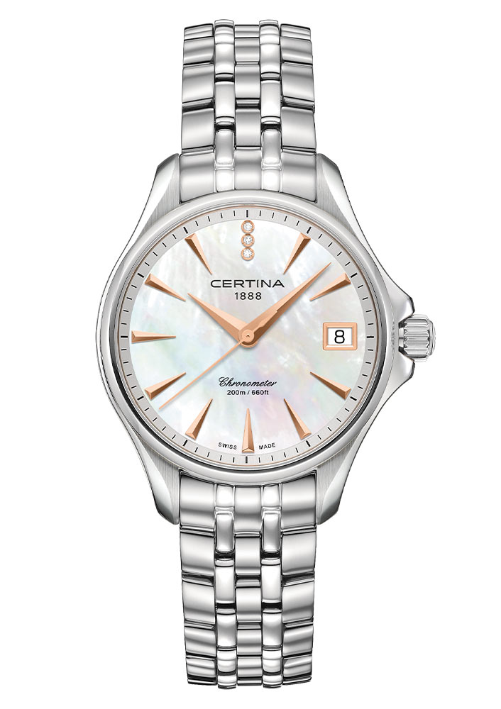 Dámské hodinky Certina DS Action Lady Diamonds Chronometer C032.051.11.116.00 . Univerzální, moderní a krásně vyrobený model DS Action Lady Diamonds je odrazem těch nejlepších vlastností moderní ženy. Bohatý duch a temperament jsou jasně patrné v hodinkách, které jsou podmanivou kompozicí broušených a leštěných ocelových povrchů a čistých a geometrických forem. Číselník je vyroben z jedinečné a duhové perleti, chráněný safírovým sklíčkem proti poškrábání s vnitřní antireflexní vrstvou, zdobený třemi třpytivými diamanty umístěnými nad sebou na 12. hodině. Pozornost přitahují také krásné indexy a indikace v růžovém zlatě PVD. Tento sportovně elegantní model s luxusním nádechem je dokonalým doplňkem každého outfitu.