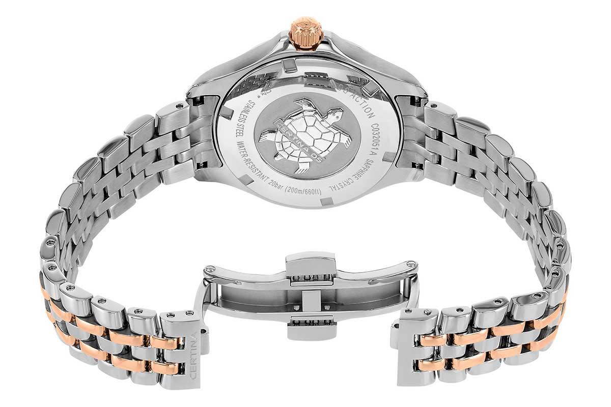 Jemná variace kolekce Certina DS Action Lady je mostem mezi dynamickým světem sportovních aktivit a zemí okouzlující, smyslné elegance. Jemné ocelové pouzdro 33,80 mm a dvoubarevný náramek hodinek je mistrovskou kombinací různých povrchových úprav. Kartáčované prvky dokonale kontrastují s leštěnými plochami ve zlatém odstínu PVD. Ocel je odolný materiál a vysoce odolná proti korozi a poškrábání, díky čemuž je perfektním doplňkem outfitu aktivního uživatele. Toho zaujme i fakt, že hodinky jsou voděodolné do 20 barů! To znamená, že s ním můžete plavat a dokonce se s ním potápět.