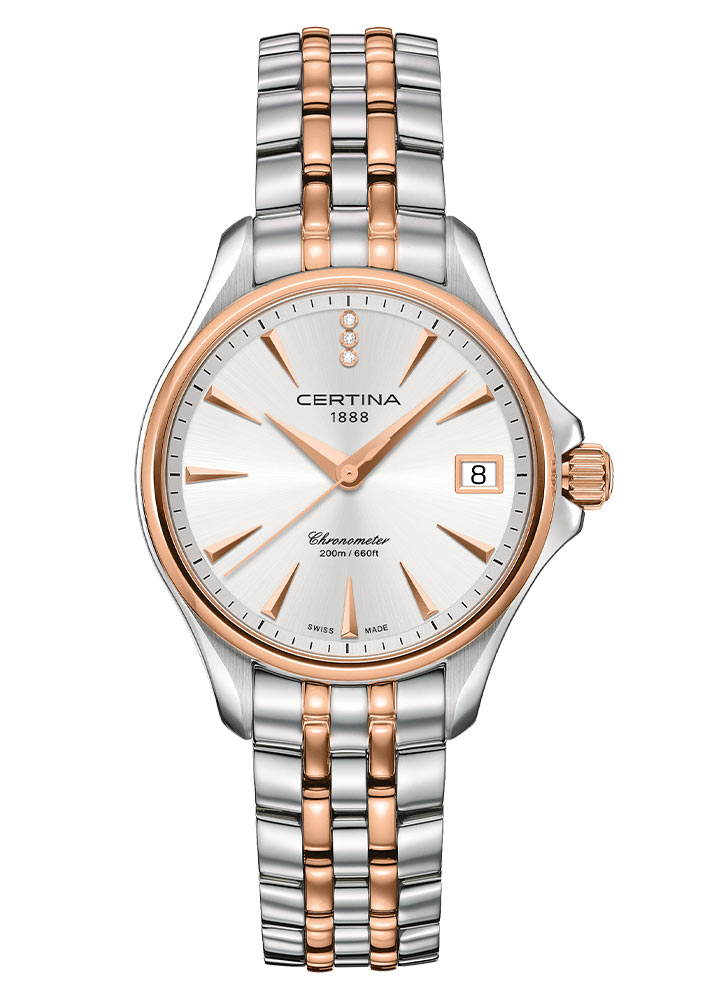 Dámské hodinky Certina DS Action Lady Diamonds Chronometer C032.051.22.036.00 . Univerzální, moderní a krásně vyrobený model DS Action Lady Diamonds je odrazem těch nejlepších vlastností moderní ženy. Bohatý duch a temperament jsou jasně patrné v hodinkách, které jsou podmanivou kompozicí broušených a leštěných ocelových povrchů a čistých a geometrických forem. Ciferník chráněný safírovým sklíčkem proti poškrábání s vnitřní antireflexní vrstvou zdobí tři třpytivé diamanty umístěné nad sebou na 12 hod. Certina používá k dekoraci pouze diamanty Top Wesselton , tedy ty s nejčistšími, zcela průhledná barva. Pozornost přitahují také krásné indexy a indikace v růžovém zlatě PVD. Tento sportovně elegantní model s luxusním nádechem je dokonalým doplňkem každého outfitu.