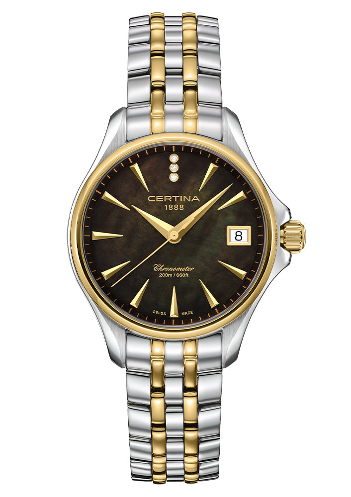 Dámské hodinky Certina DS Action Lady Diamonds Chronometer C032.051.22.126.01. Univerzální, moderní a krásně vyrobený model DS Action Lady Diamonds je odrazem těch nejlepších vlastností moderní ženy. Bohatý duch a temperament jsou jasně patrné v hodinkách, které jsou podmanivou kompozicí broušených a leštěných ocelových povrchů a čistých a geometrických forem. Unikátní a opalizující ciferník z tmavé perleti, chráněný safírovým sklíčkem proti poškrábání s vnitřní antireflexní vrstvou, zdobí tři lesklé diamanty umístěné nad sebou na 12 hodině Certina Diamanty Wesselton na ozdobu, tedy ty s nejčistší, zcela průhlednou barvou. Pozornost přitahují také krásné PVD zlaté indexy a displeje. Tento zároveň sportovní a elegantní model s luxusním tónem je dokonalým doplňkem každého outfitu.