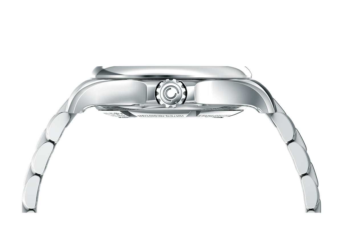 Safírové sklo téměř odolné proti poškrábání s antireflexní vrstvou přidává další prémiový komponent do těchto elegantních dámských náramkových hodinek. Je opravdu důležité, aby vytříbená krása byla stejně přitažlivá, jako trvanlivá v průběhu času a proti každodenním výzvám. Budoucí majitel výše uvedených hodinek si může být jistý, že Certina, značka s ne náhodným symbolem želví krunýře ve svém logu, znamenající spolehlivost a odolnost, je profesionálním výrobcem nadčasové elegance. Model s referenčním číslem C032.207.11.116.00 má zabudovaný dvojitý bezpečnostní systém DS Concept, se kterým je značka identifikována již od roku 1959. Díky ní je časomíra nesrovnatelně odolná, a proto si poradí se svým majitelem, který žije i v neustálém shonu. Smyslný ciferník vyrobený z jedinečné perleti, moderní kombinace oceli a zlatého PVD povlaku a přírodních diamantů v kombinaci s přesností a pevností je cenným plodem vícegenerační tradice švýcarské značky.