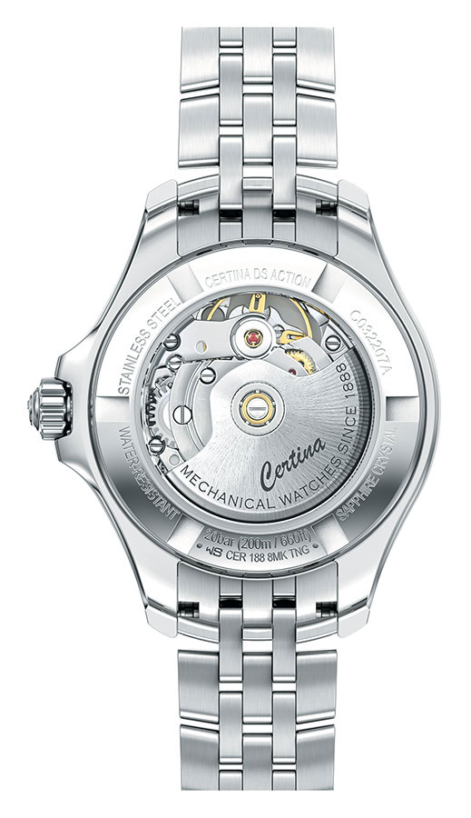 Certina DS Action Lady Powermatic 80 C032.207.11.116.00 jsou bižuterní dámské hodinky s diamanty Top Wesselton a třpytivou perleťou v pouzdře vyrobeném z vysoce kvalitní oceli, ideální pro ženy, které chtějí každý den okusit trochu luxusu. ETA Powermatic 80, vybavený nejmodernějším automatickým kalibrem, poskytuje přesnost a výkon, o čemž svědčí přibližně 80hodinová rezerva chodu. Mechanismus je také vybaven antimagnetickou vlasovou pružinou Nivachron™, která chrání zařízení před účinky všudypřítomných magnetických polí. Jeho autentickou práci a tradiční konstrukci lze obdivovat přes zadní stranu pouzdra ze safírového skla. Vysoká třída vodotěsnosti až 200 metrů dosažená mimo jiné díky šroubovací korunce a zadní části pouzdra z ní dělá také perfektní hodinky pro potápění během exotických dovolených. Během večerní večeře, po nezapomenutelném podvodním zážitku, se model Certina DS Action Lady promění v třpytivé diamantové, zlaté a bronzové zdobení, povznášející magickou náladu.