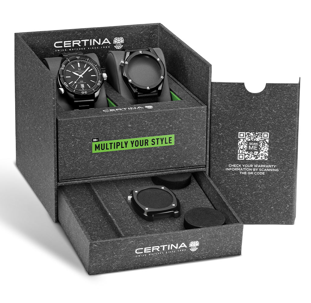 Koncept sady Certina DS+ obsahuje tři hlavní komponenty: hodinky, pouzdro hodinek a řemínek. Každý prvek je nezávislý a umožňuje jejich libovolnou kombinaci. Kulaté hodinky se vkládají zespodu do jednoho z nerezových pouzder a bezpečně se šroubují na místo pomocí samostatné korunky na pouzdře. Inovativní těsnění z rostlinného materiálu zaručuje dokonalé utěsnění. Očka pro vložení páskových teleskopů jsou umístěna na pouzdře, což umožňuje využít rychlovýměnný systém Certina pro připevnění pásku dle vlastního výběru.