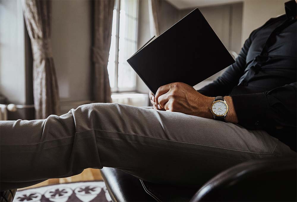 Dalším prvkem, který také upoutá a skvěle naladí, je čistý bílý ciferník s tenkými zlatými indexy a luminiscenčními ručičkami. Jeho jednoduchost dokonale kondenzuje luxus plynoucí z komponentů, které jsou na něm umístěny. Takto vyvážených proporcí mohli dosáhnout pouze designoví virtuosové.