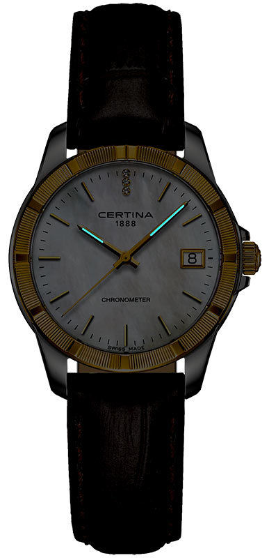 Zlato, diamanty, perleť – jeden z nejkrásnějších a nejcennějších stavebních materiálů, kterému žádná žena krásně neodolá. Jediný pohled na tyto exkluzivní hodinky stačí k tomu, abyste se zcela poddali jeho kouzlu. Zlatá surovina je po staletí ceněná a vyhledávaná. A není divu. Jeho hřejivý lesk dokonale zvýrazní všechny tóny pleti, což už zjistilo mnoho žen. Zlato se také stalo globálním ukazatelem dlouhodobé hodnoty. Mimo jiné i z tohoto důvodu se je výrobci Certina, jejichž cílem je co nejvyšší a věčná odolnost, rozhodli použít k výrobě dalekohledu jako celek. Pevný rámeček z 18K žlutého zlata dělá z těchto hodinek skvělý příklad švýcarského hodinářství, které je stejně úžasné jako nadčasové.