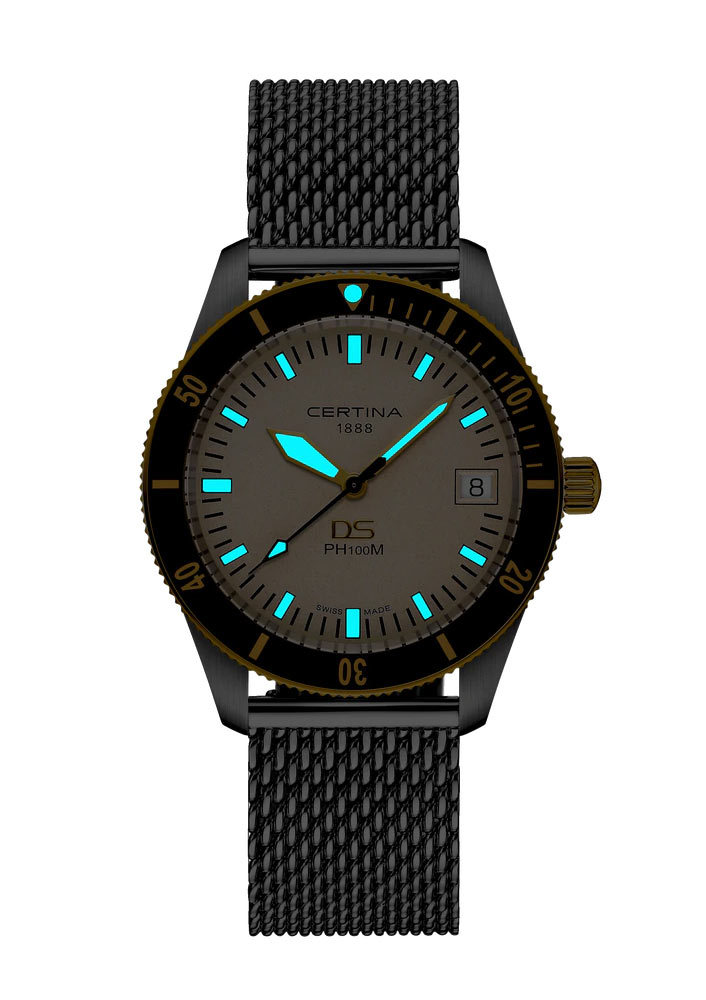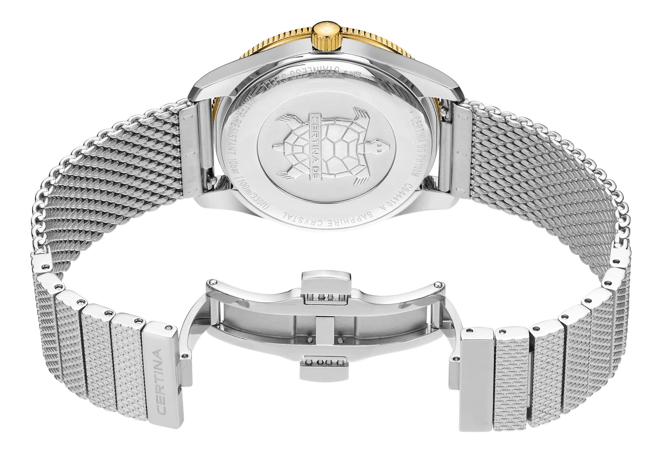 Pánské hodinky Certina jsou vybaveny mimořádně odolným safírovým sklem s antireflexní úpravou, které je odolné proti poškrábání. Sklo chrání stříbrný číselník. Čas ukazují velké ručičky pokryté luminiscenční vrstvou Super-LumiNova®, která svítí ve tmě. Svítící značka se nachází také na indexech a na pozici dvanácti hodin na otočné lunetě. Funkčnost číselníku doplňuje okénko s datem na pozici třetí hodiny. Na světlém pozadí je zobrazován aktuální den v měsíci. Vše pohání švýcarský mechanismus ETA Precidrive™, který je známý svou vysokou přesností. Strojek disponuje užitečnou funkcí úspory energie. Když bude potřeba vyměnit baterii, systém End Of Life zpomalí pohyb sekundové ručičky – bude se pohybovat po několika sekundách.